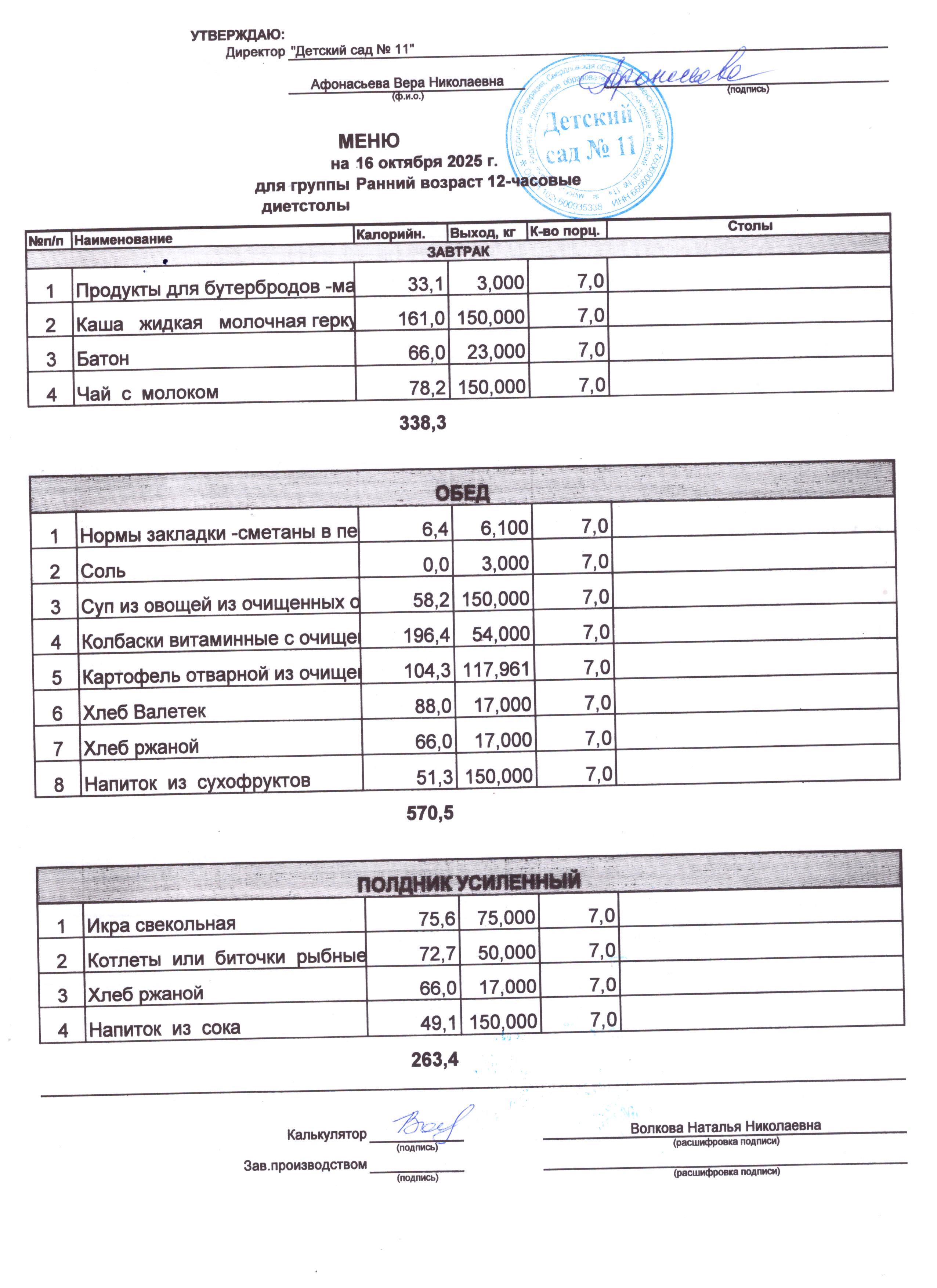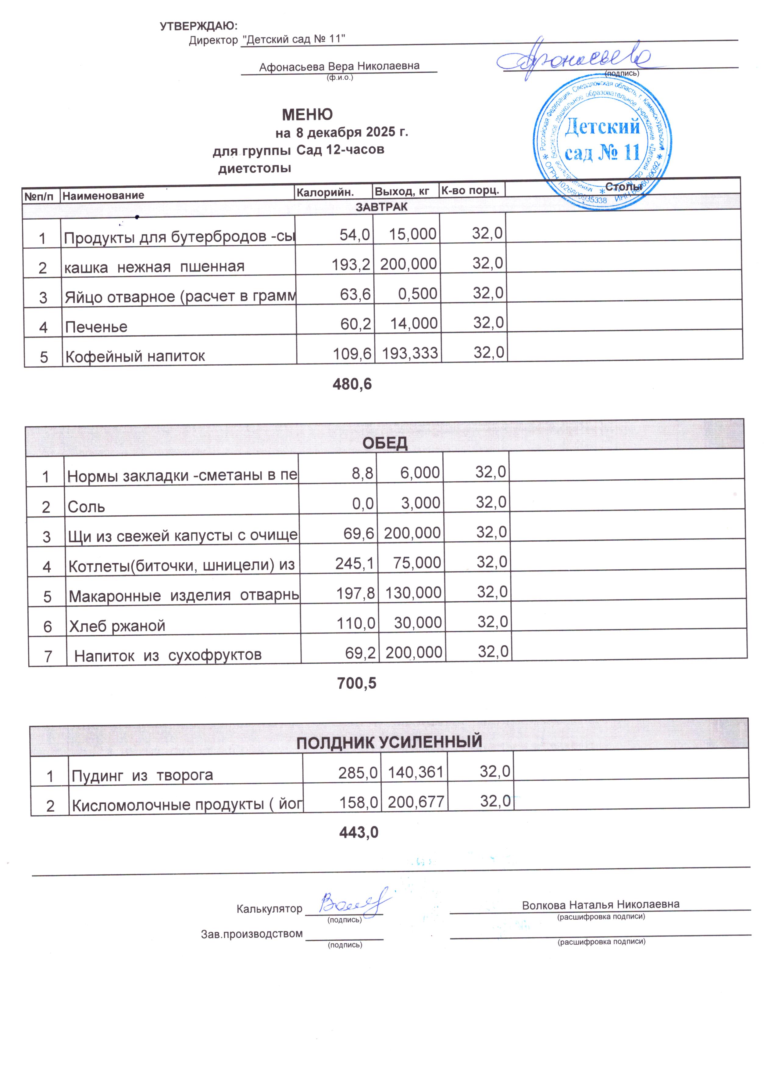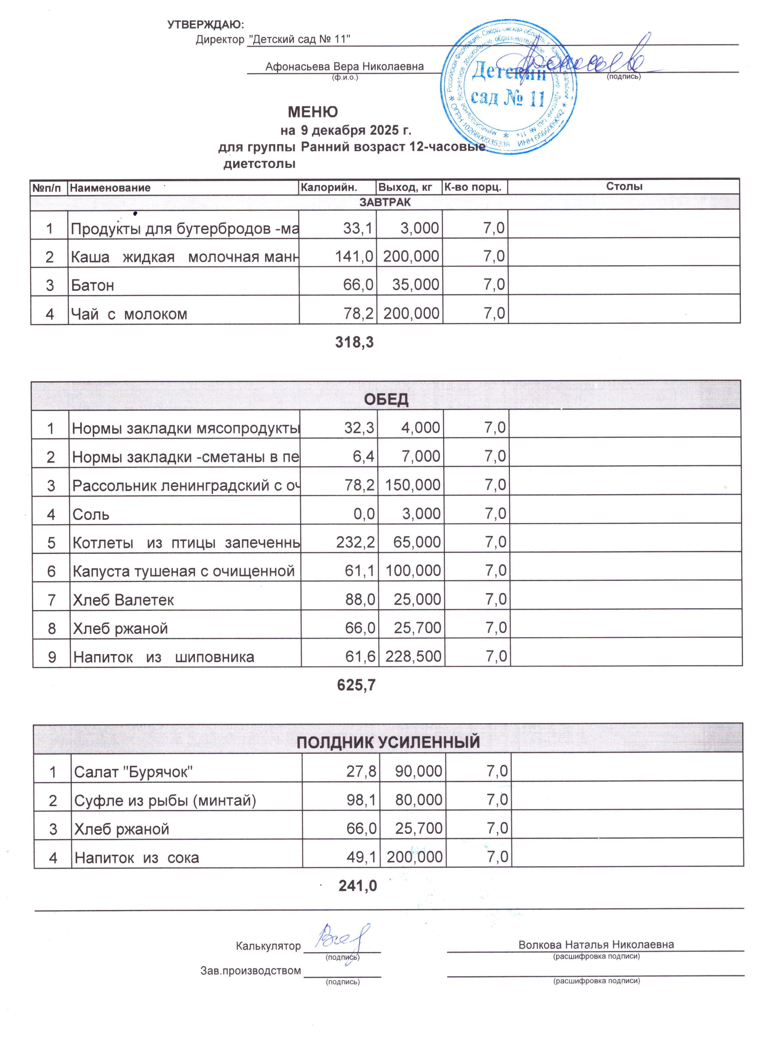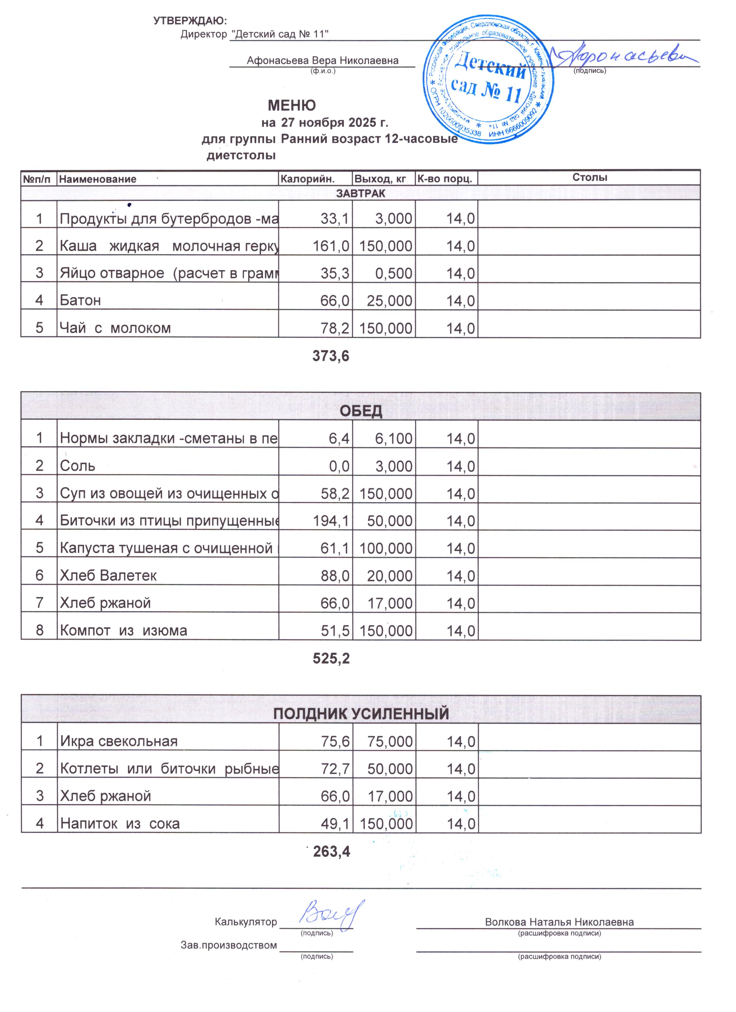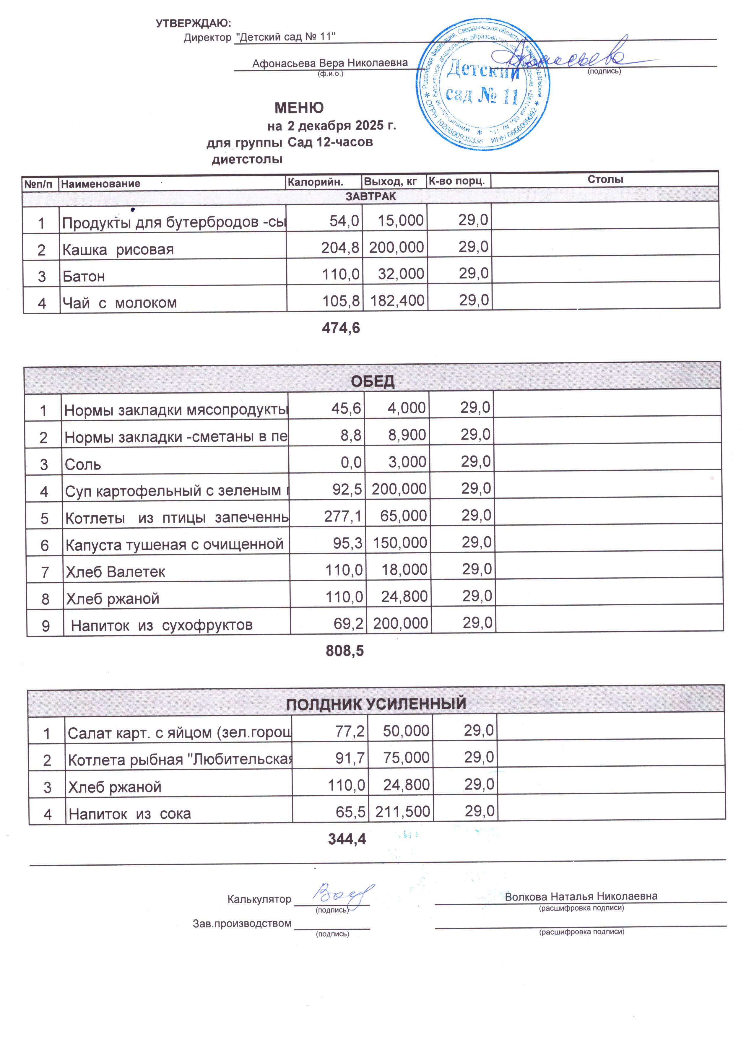 - Соки, фрукты, кисломолочные напитки включены в усиленный полдник.