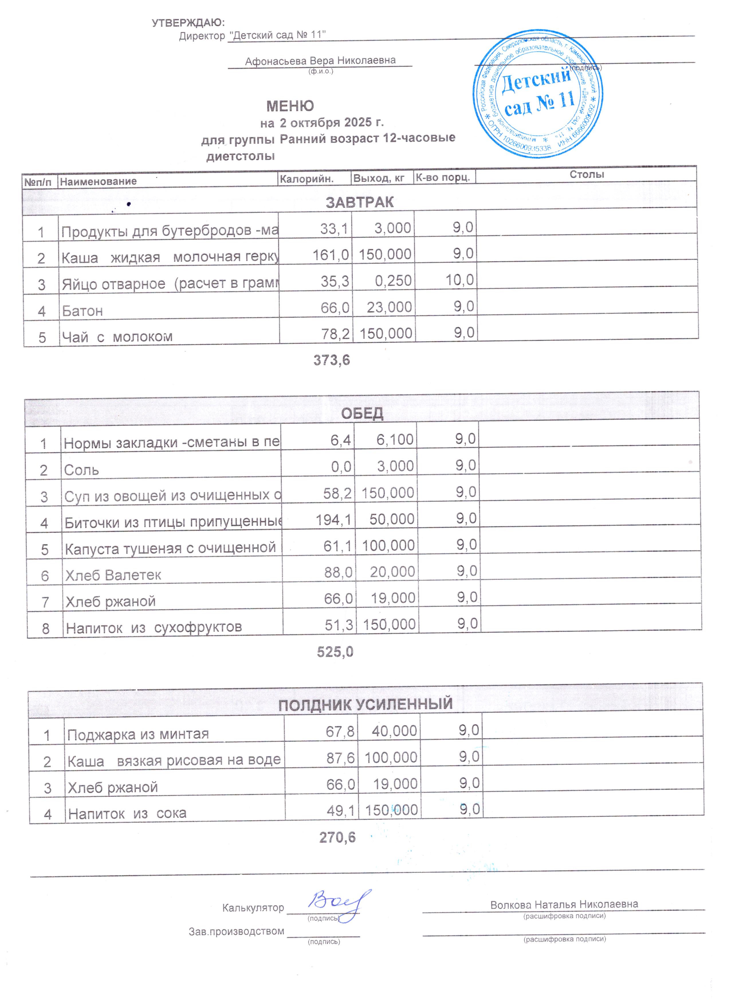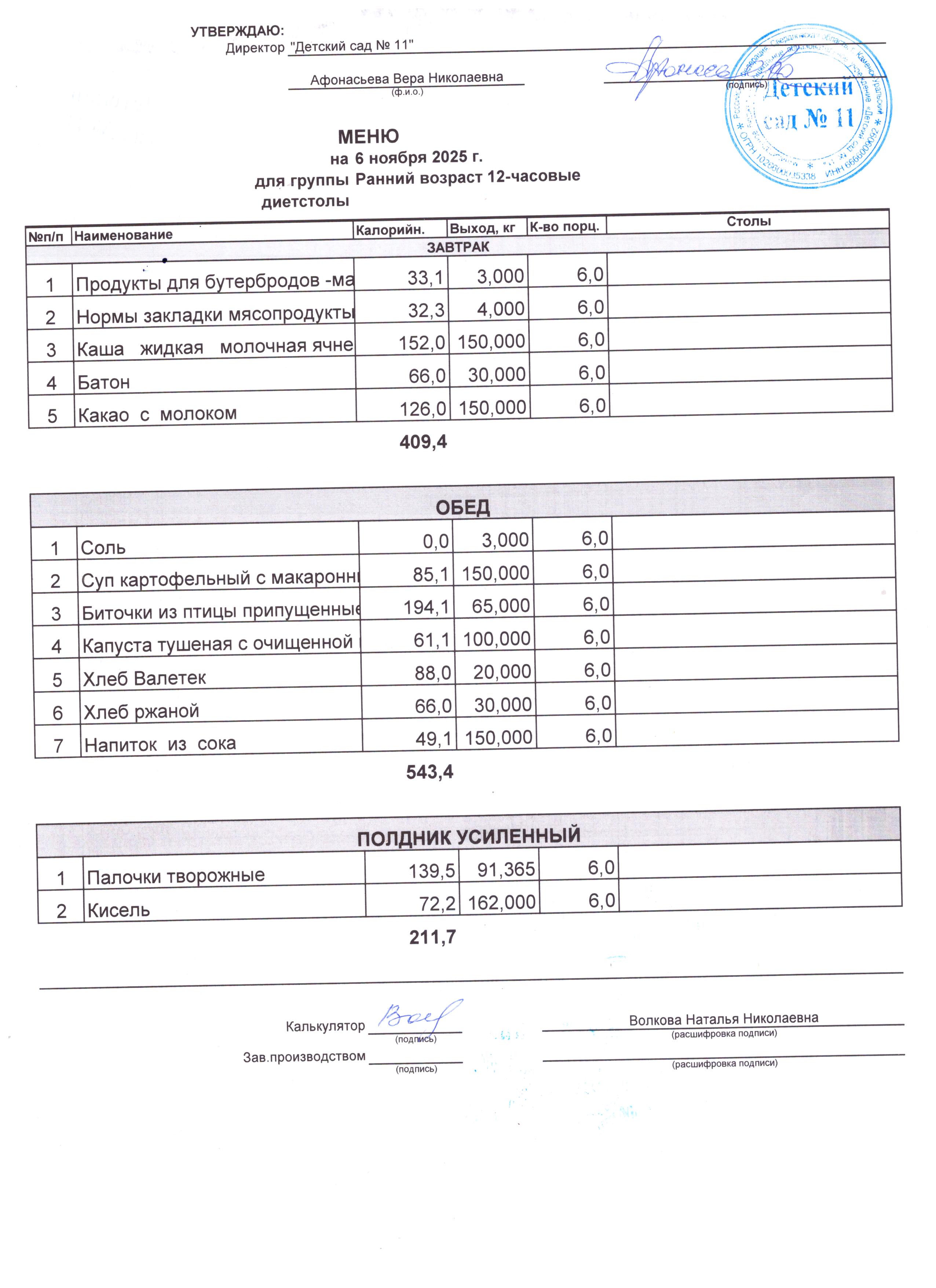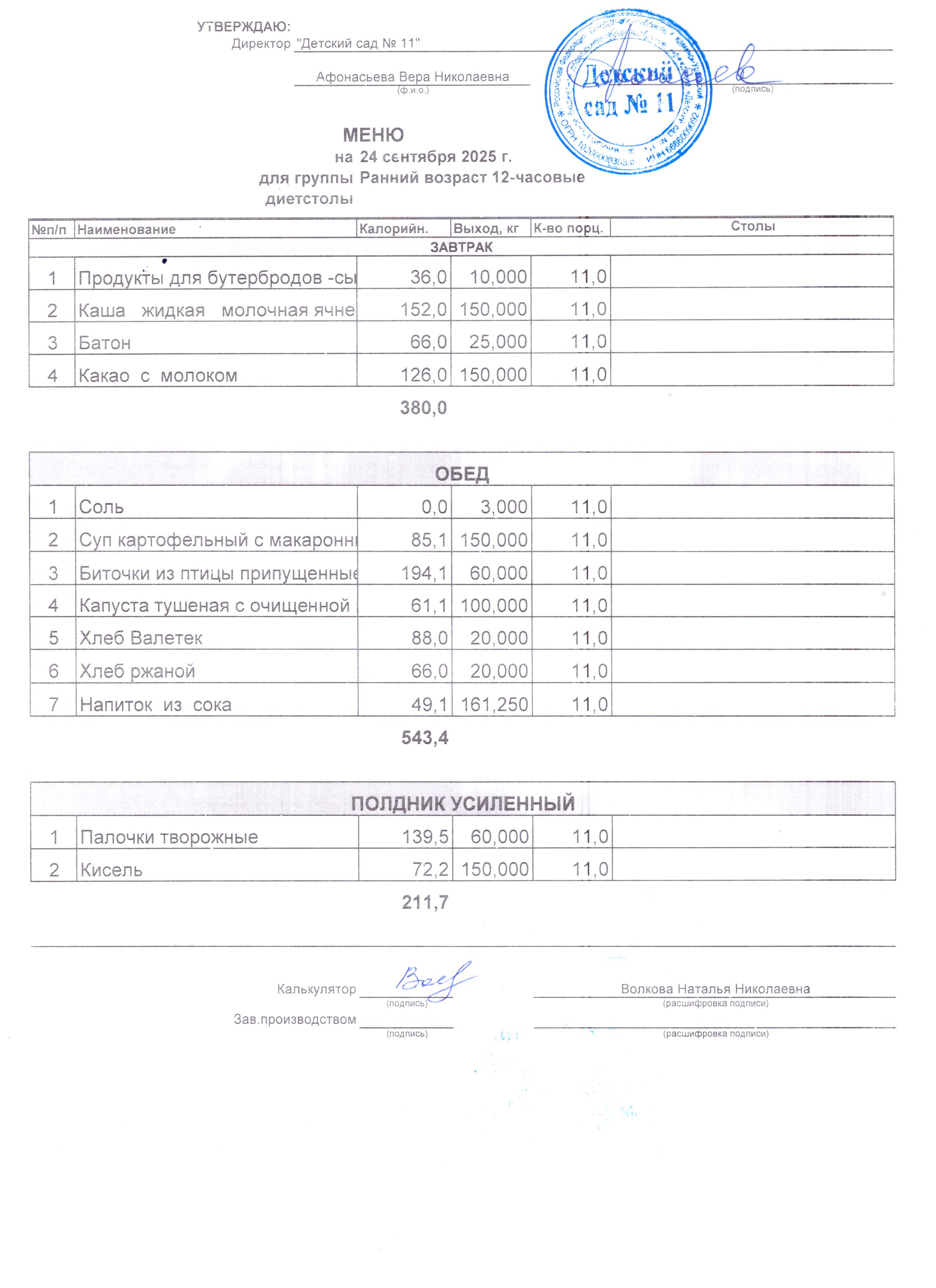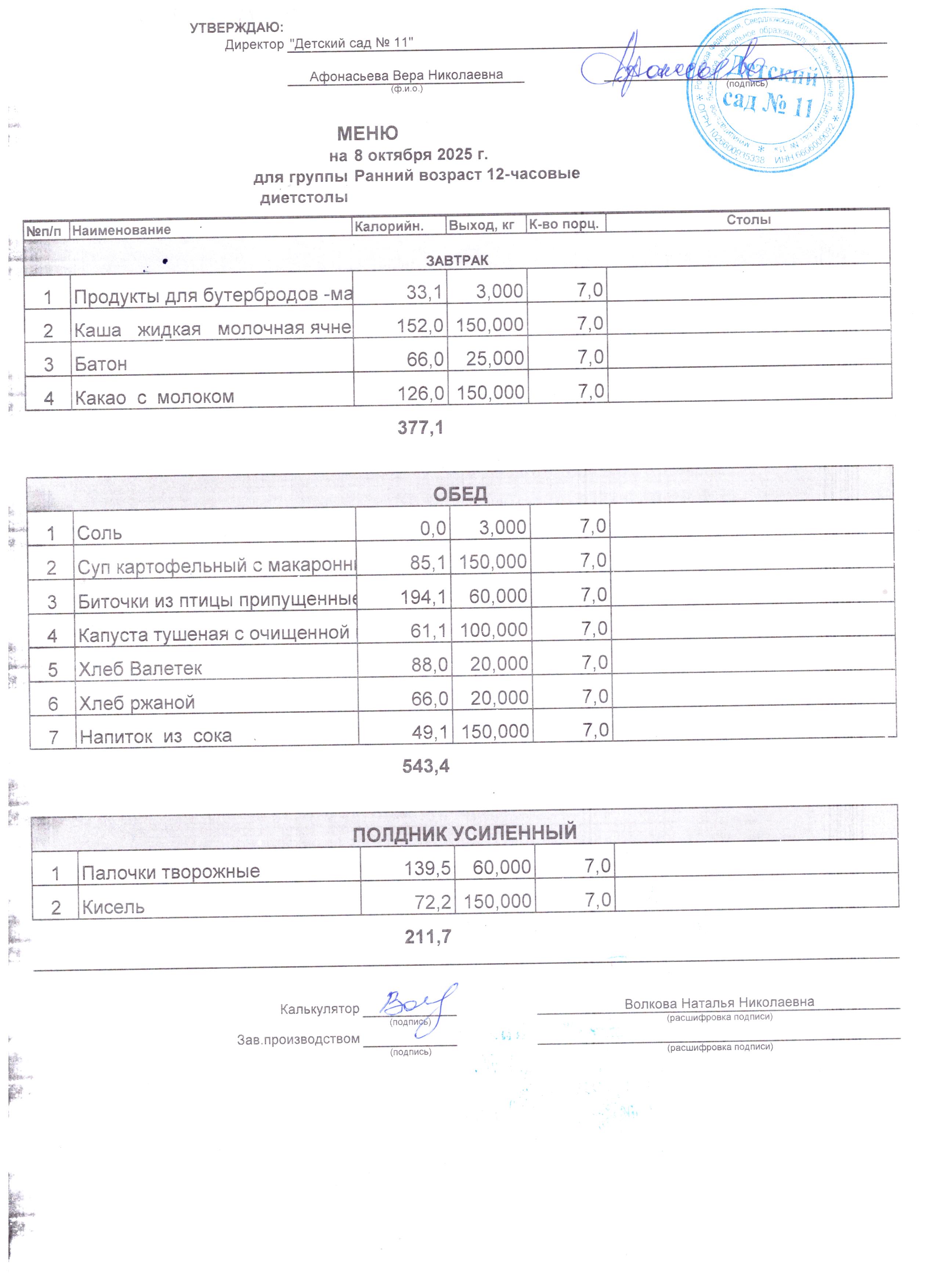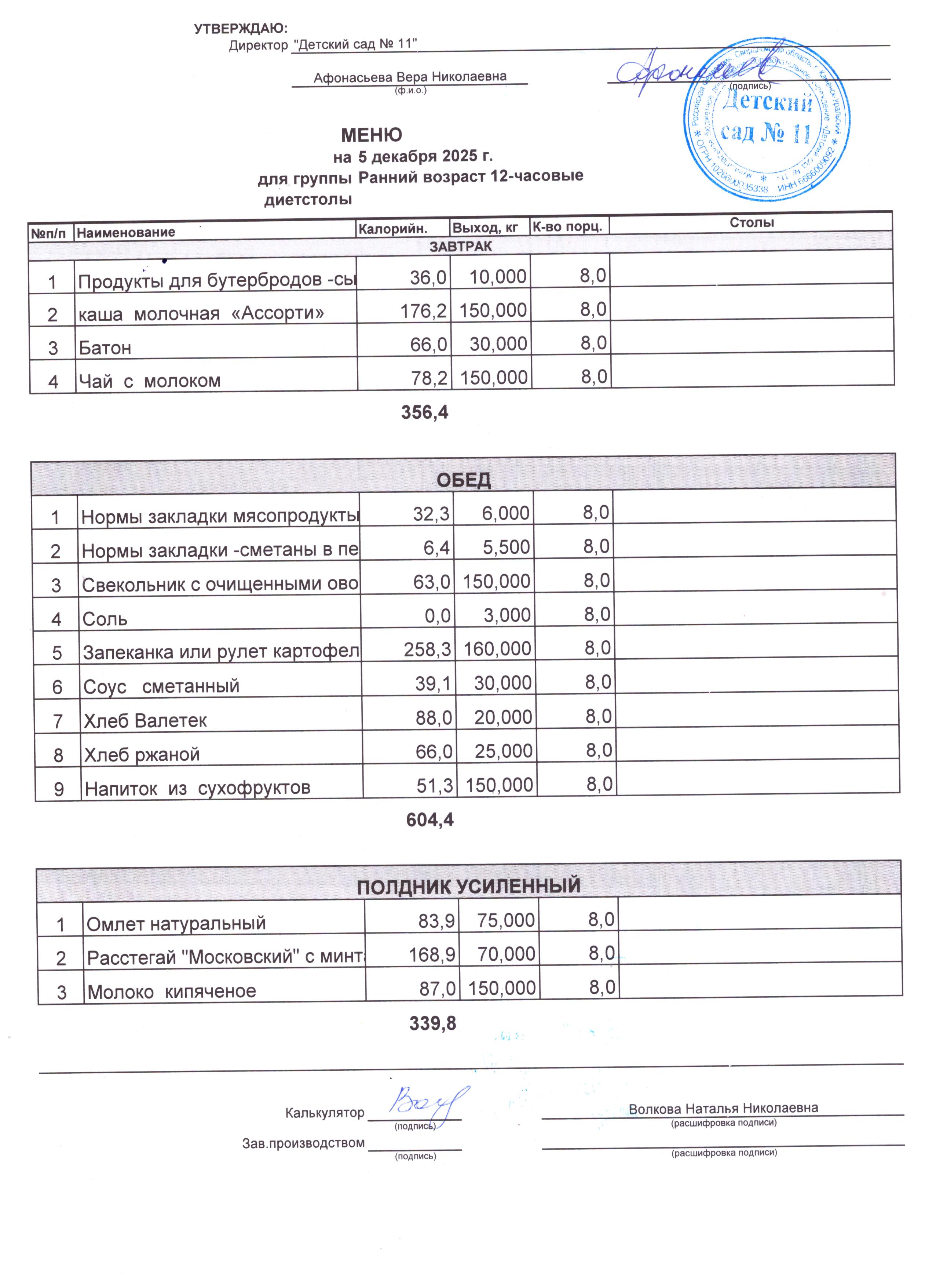 - Соки, фрукты, кисломолочные напитки включены в усиленный полдник.