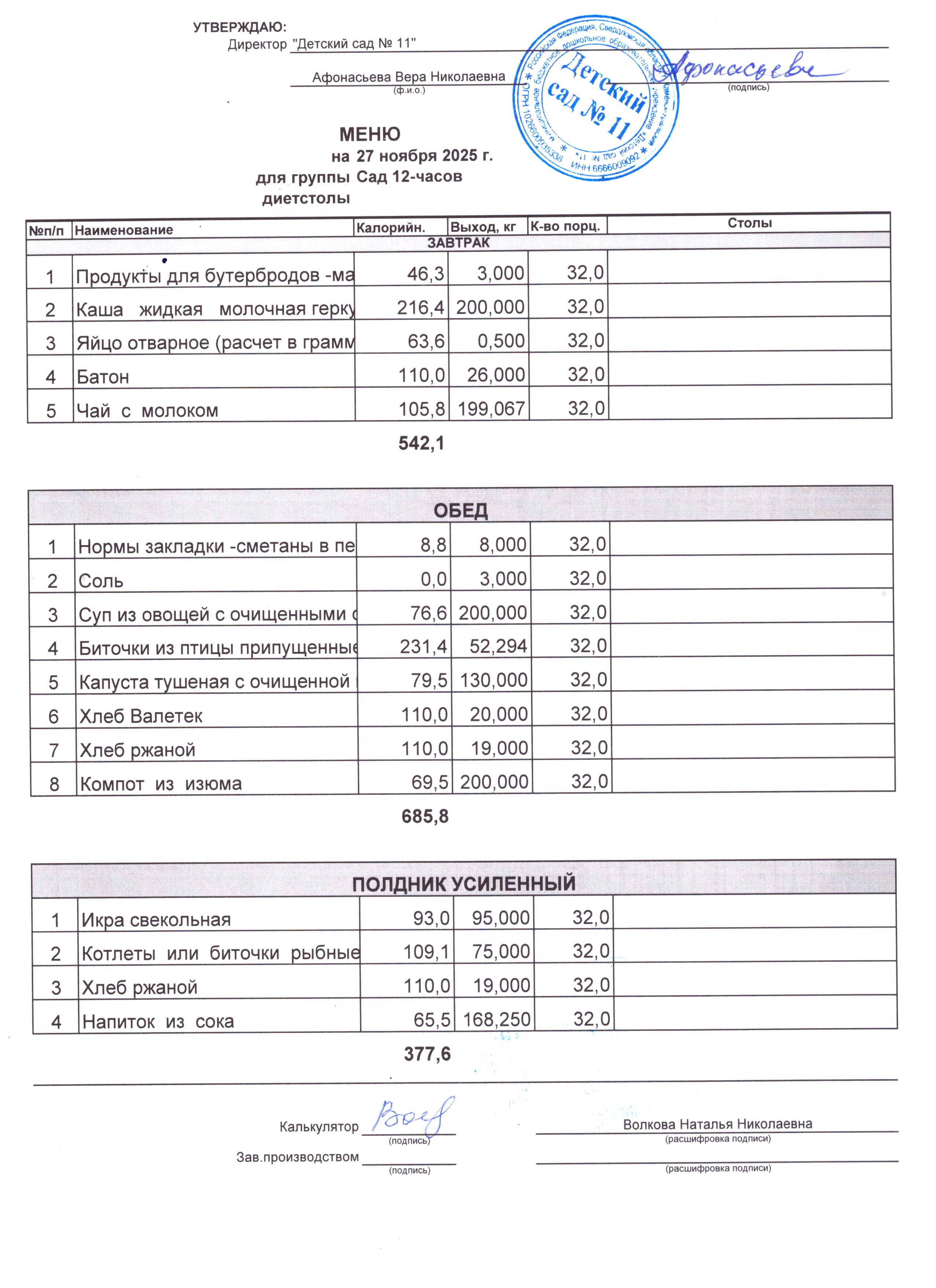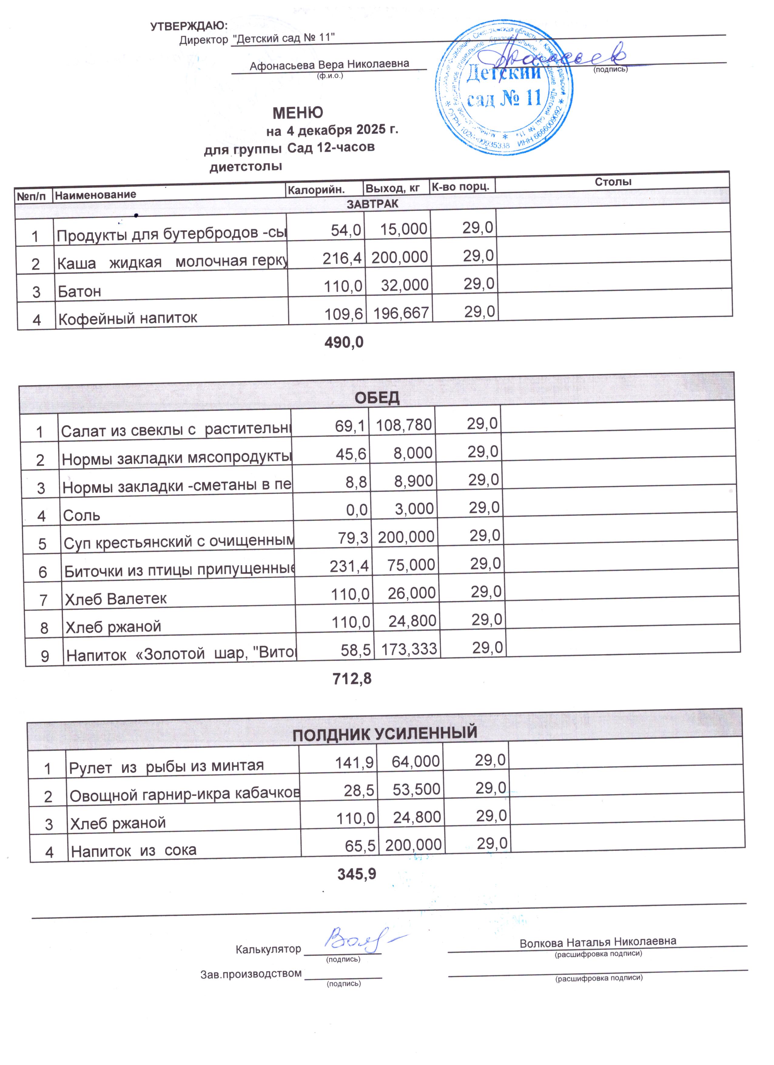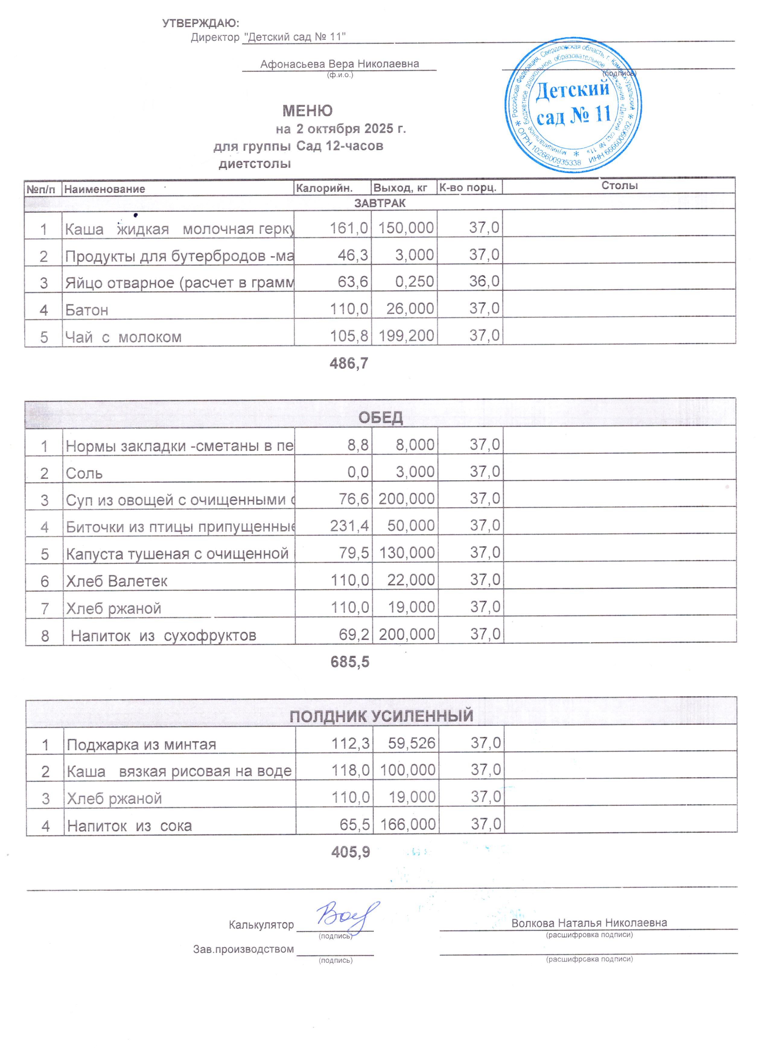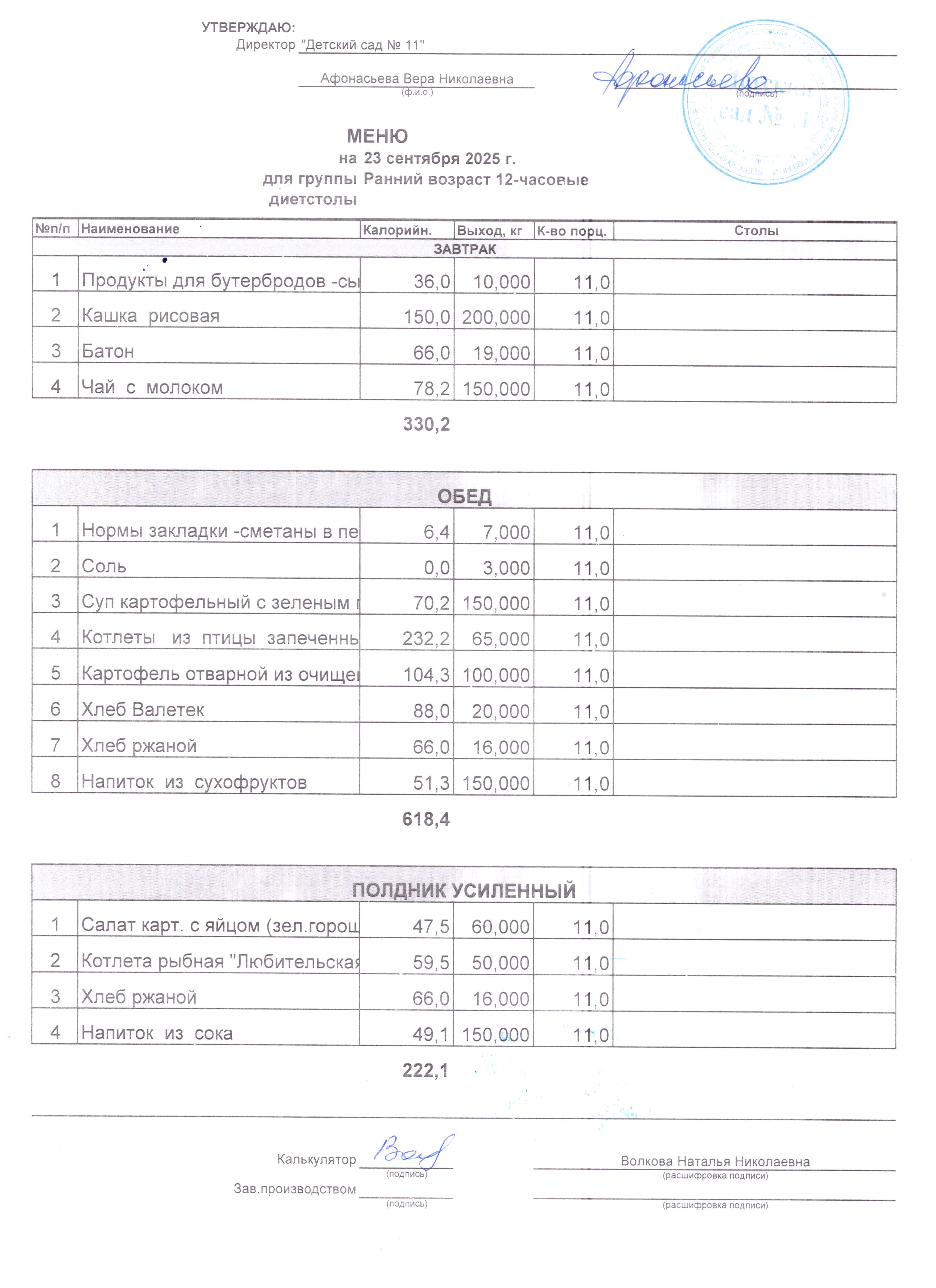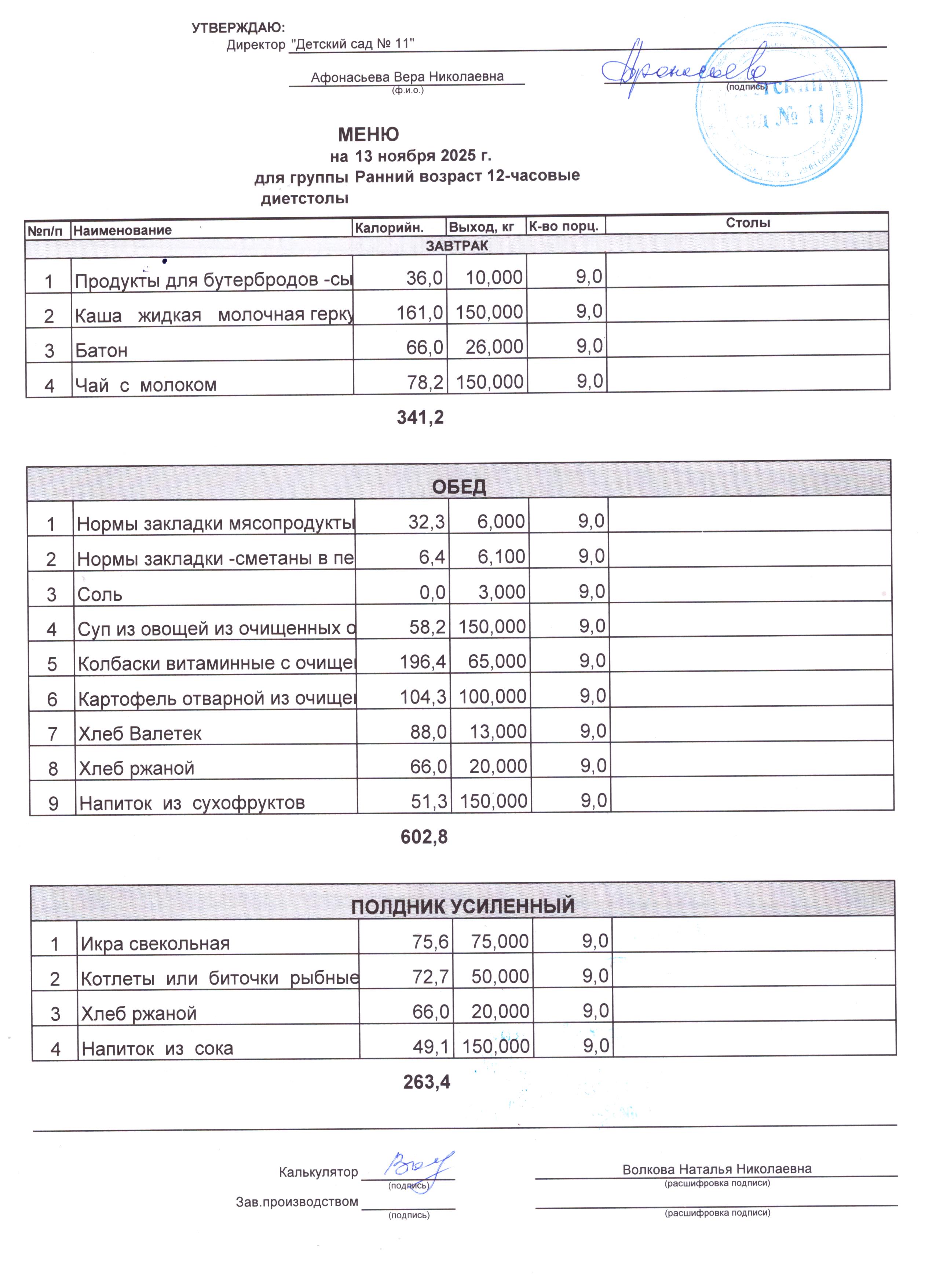 - Соки, фрукты, кисломолочные напитки включены в усиленный полдник.