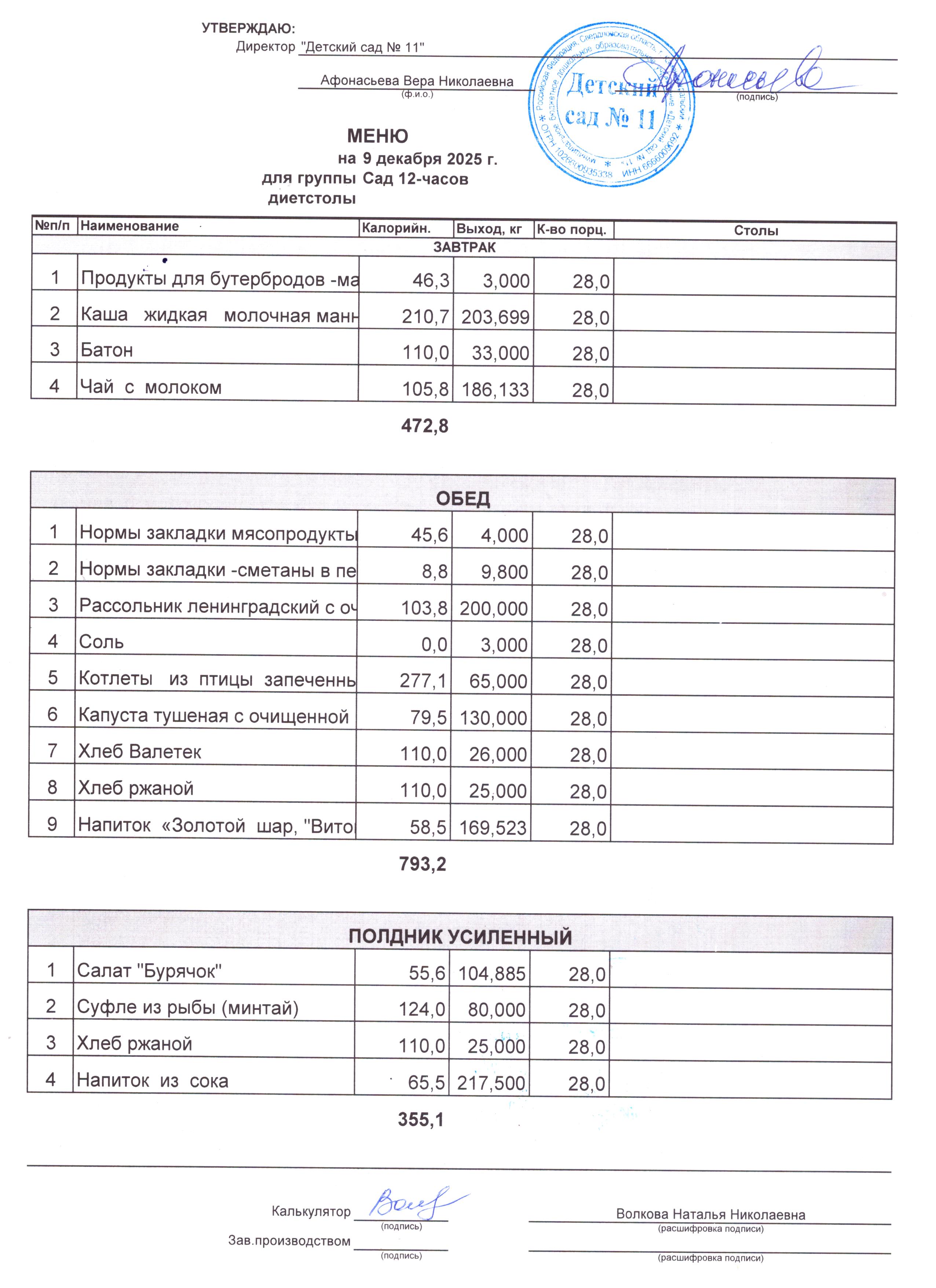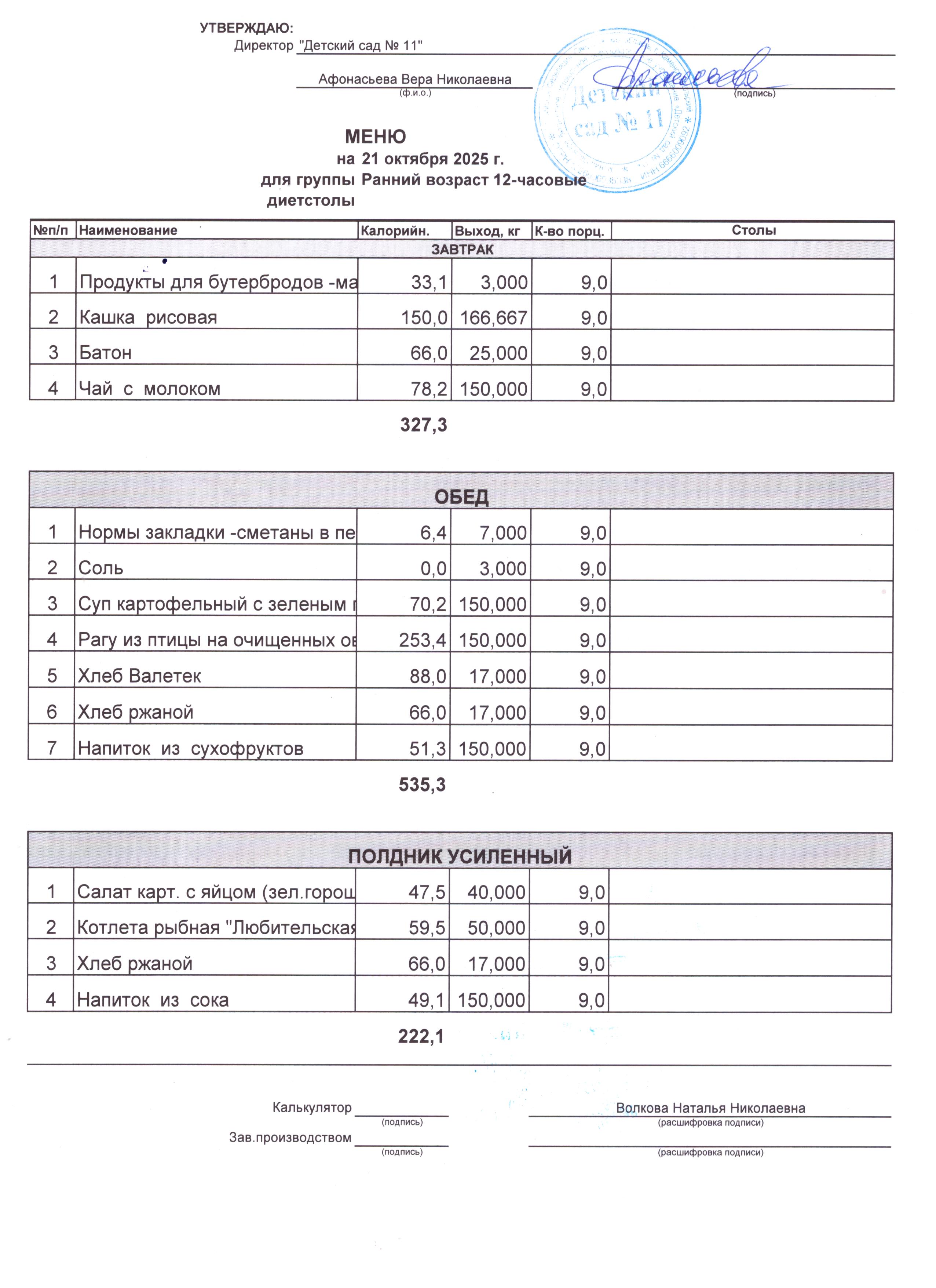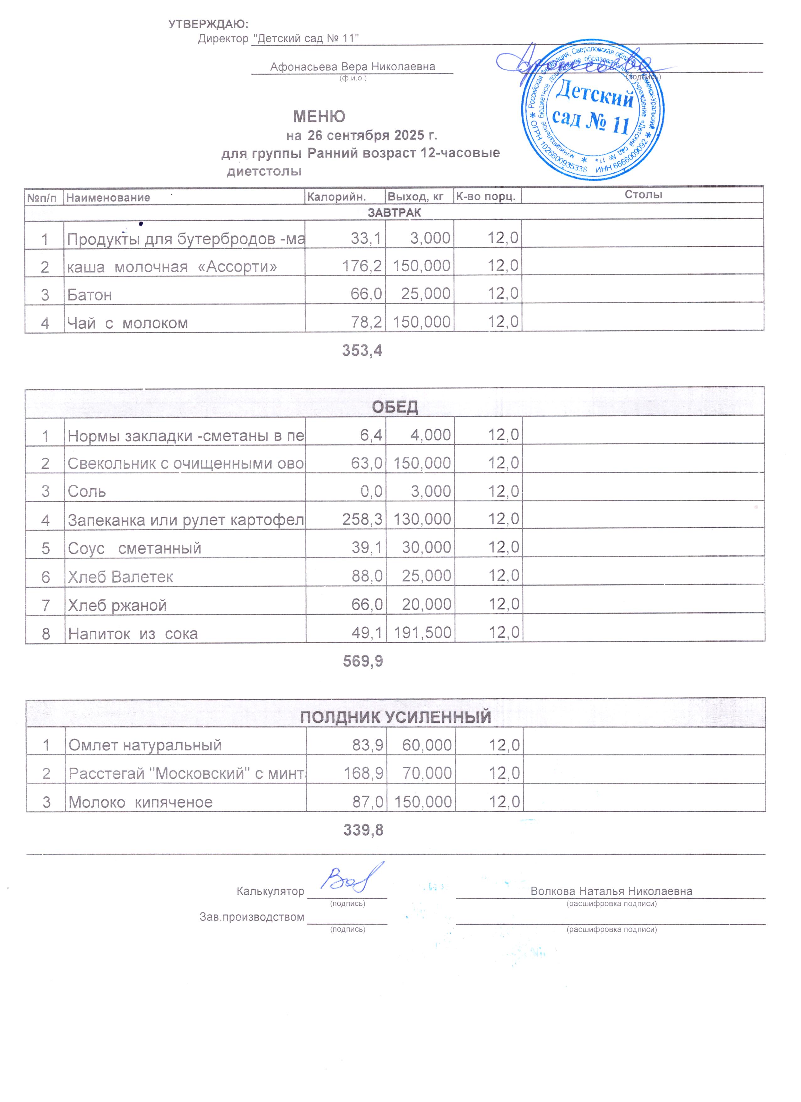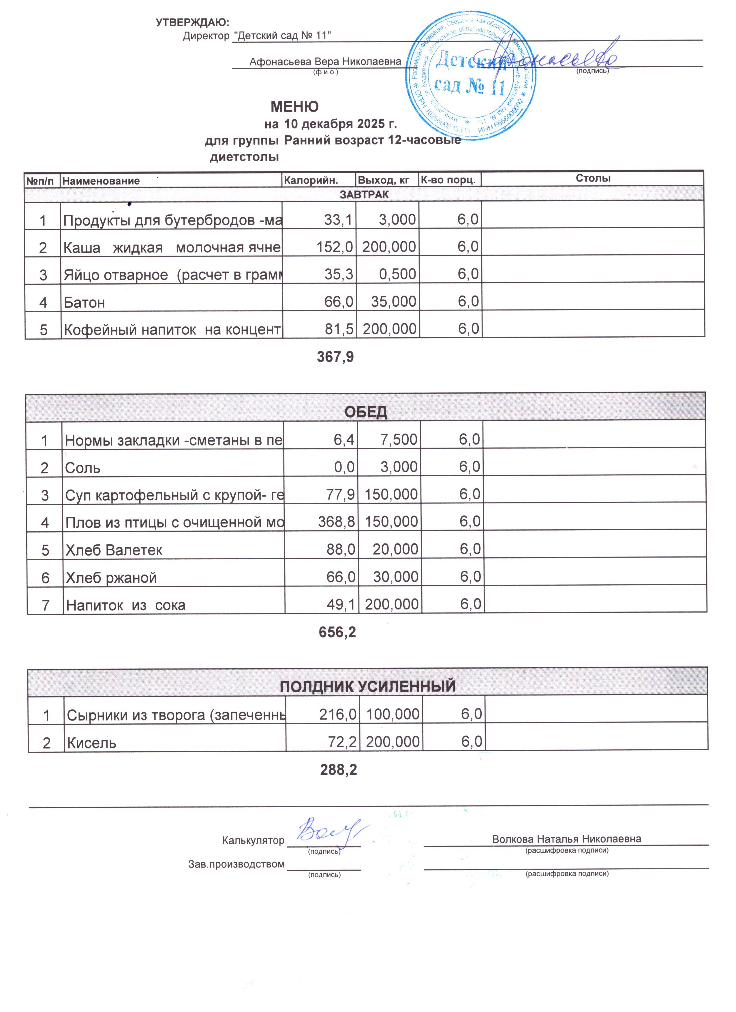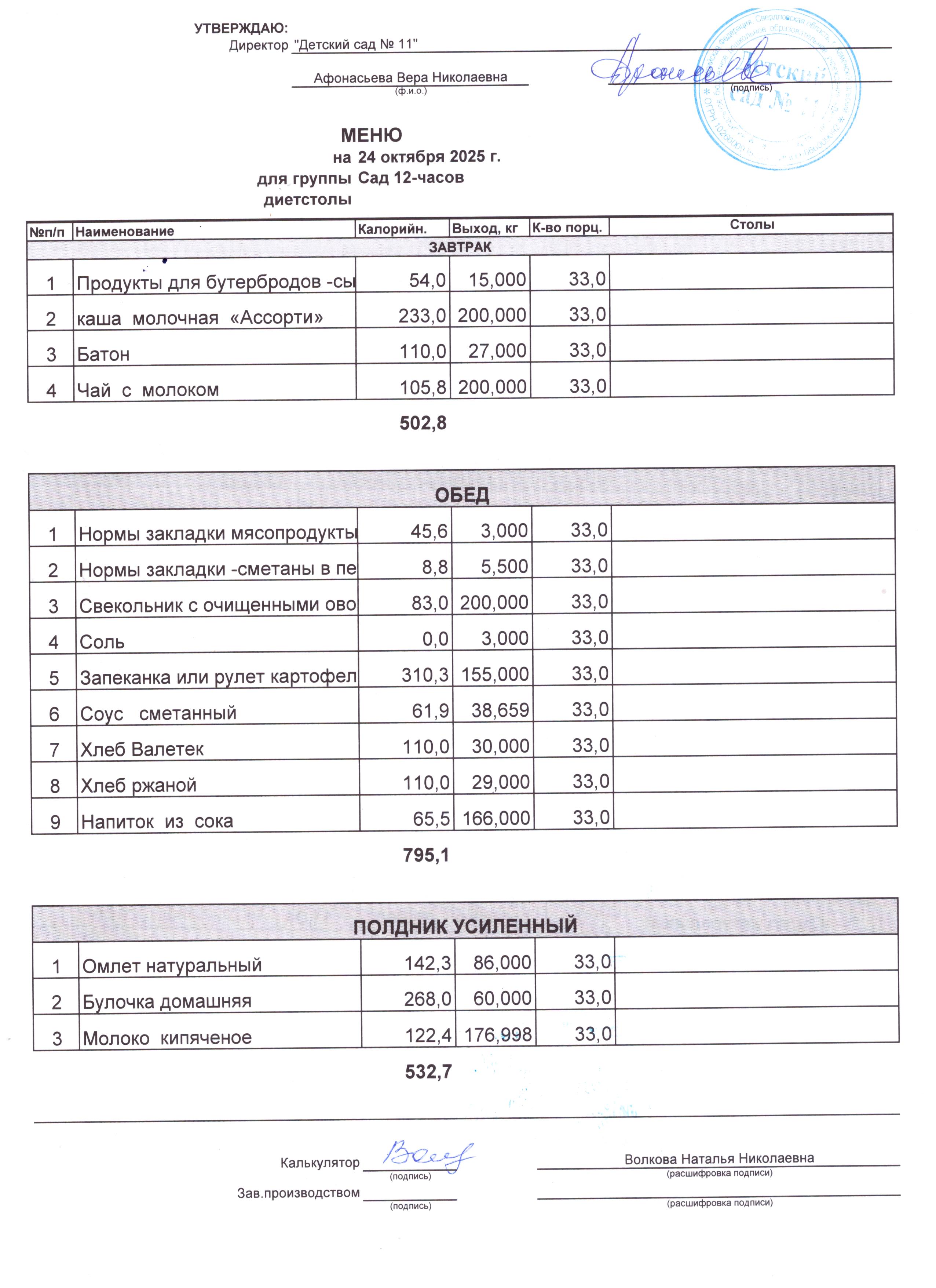 - Соки, фрукты, кисломолочные напитки включены в усиленный полдник.