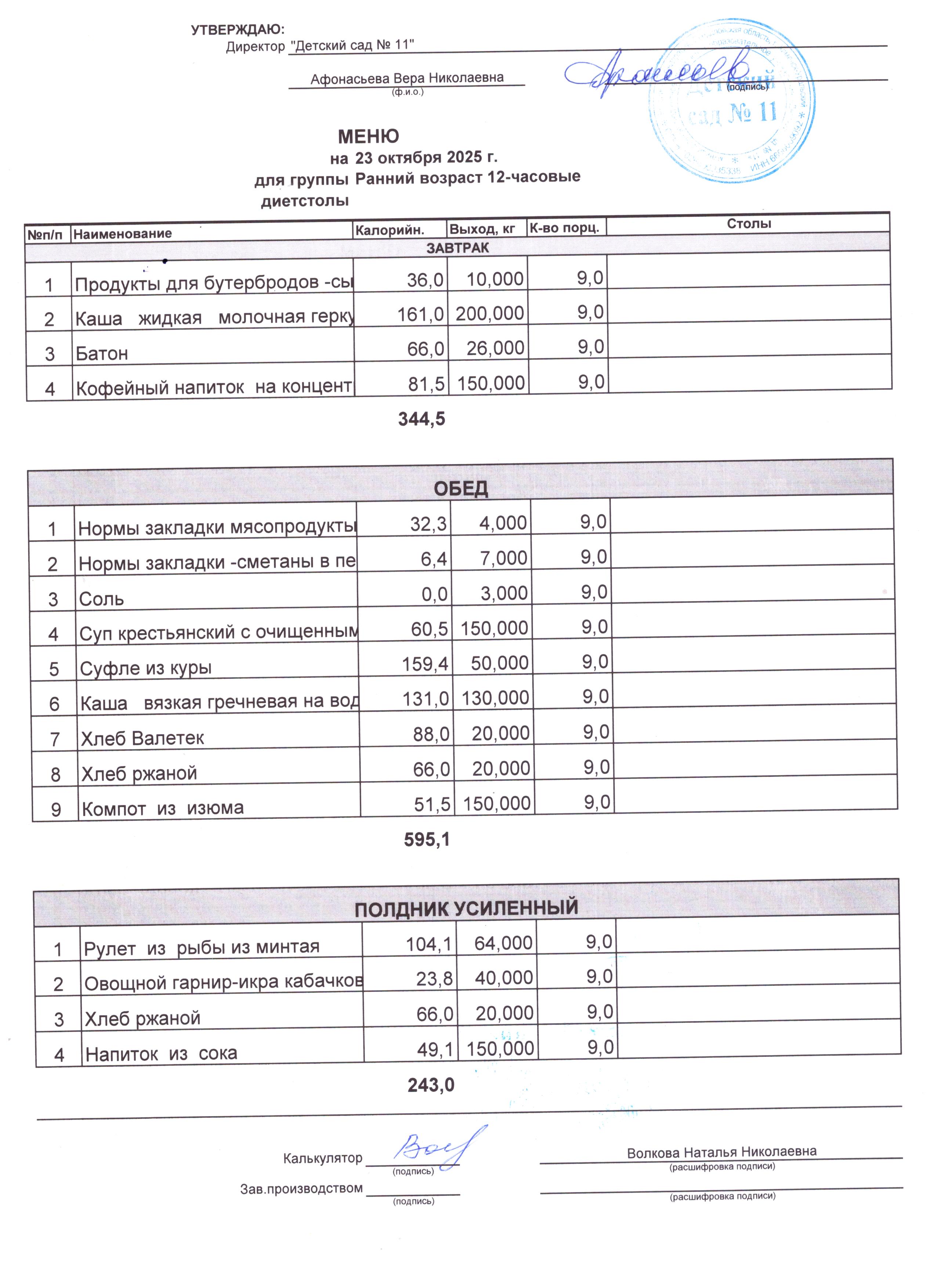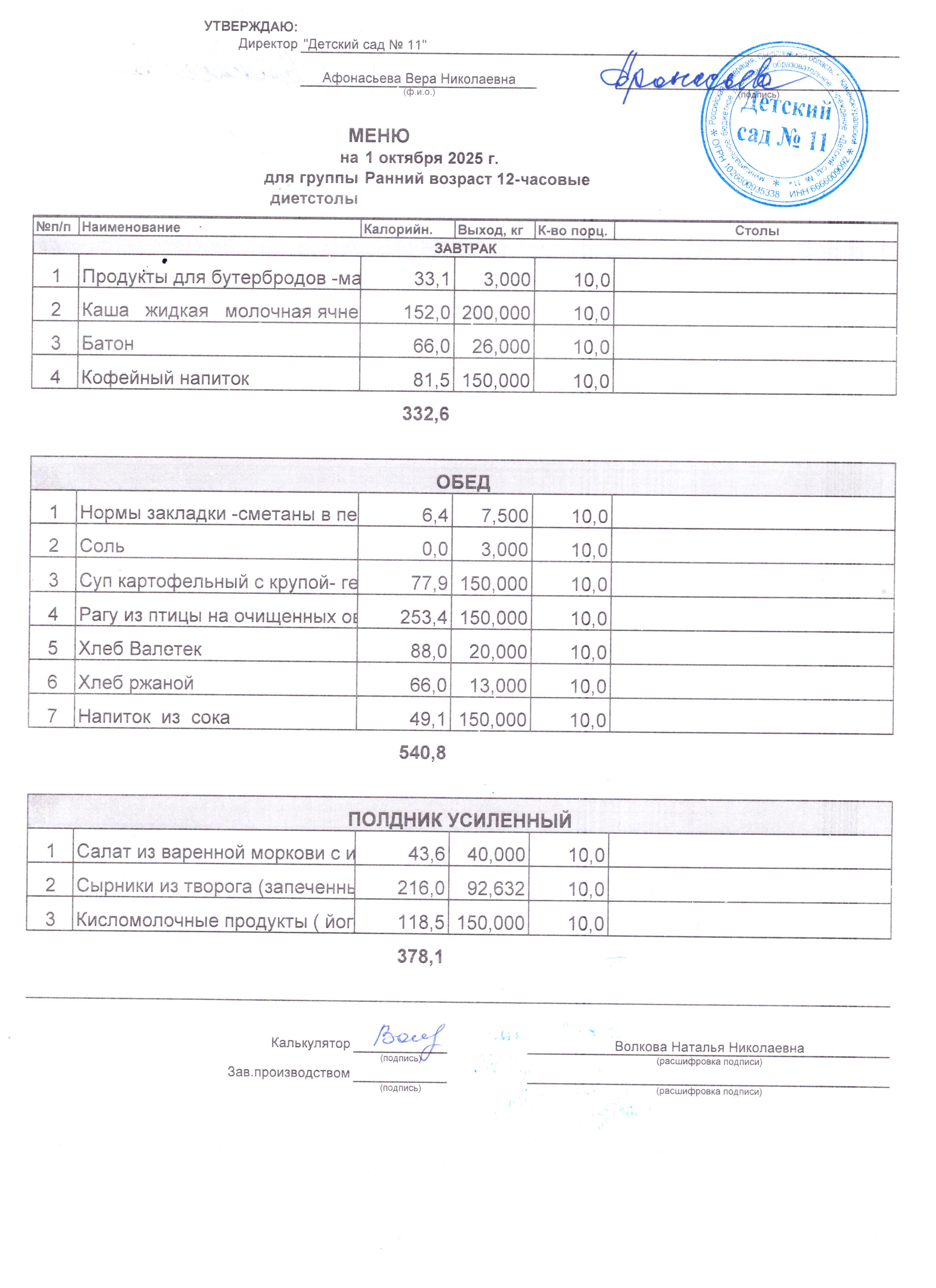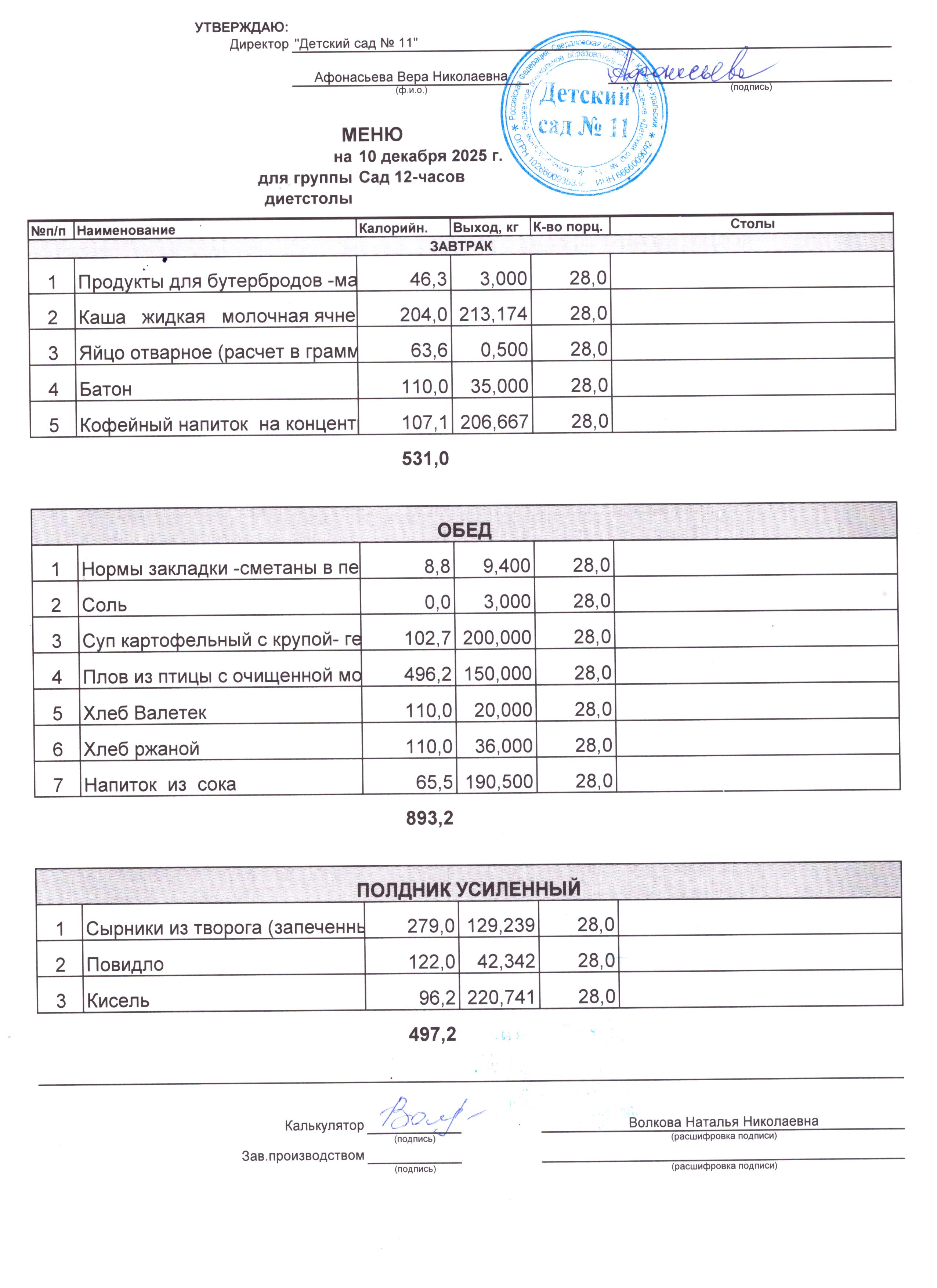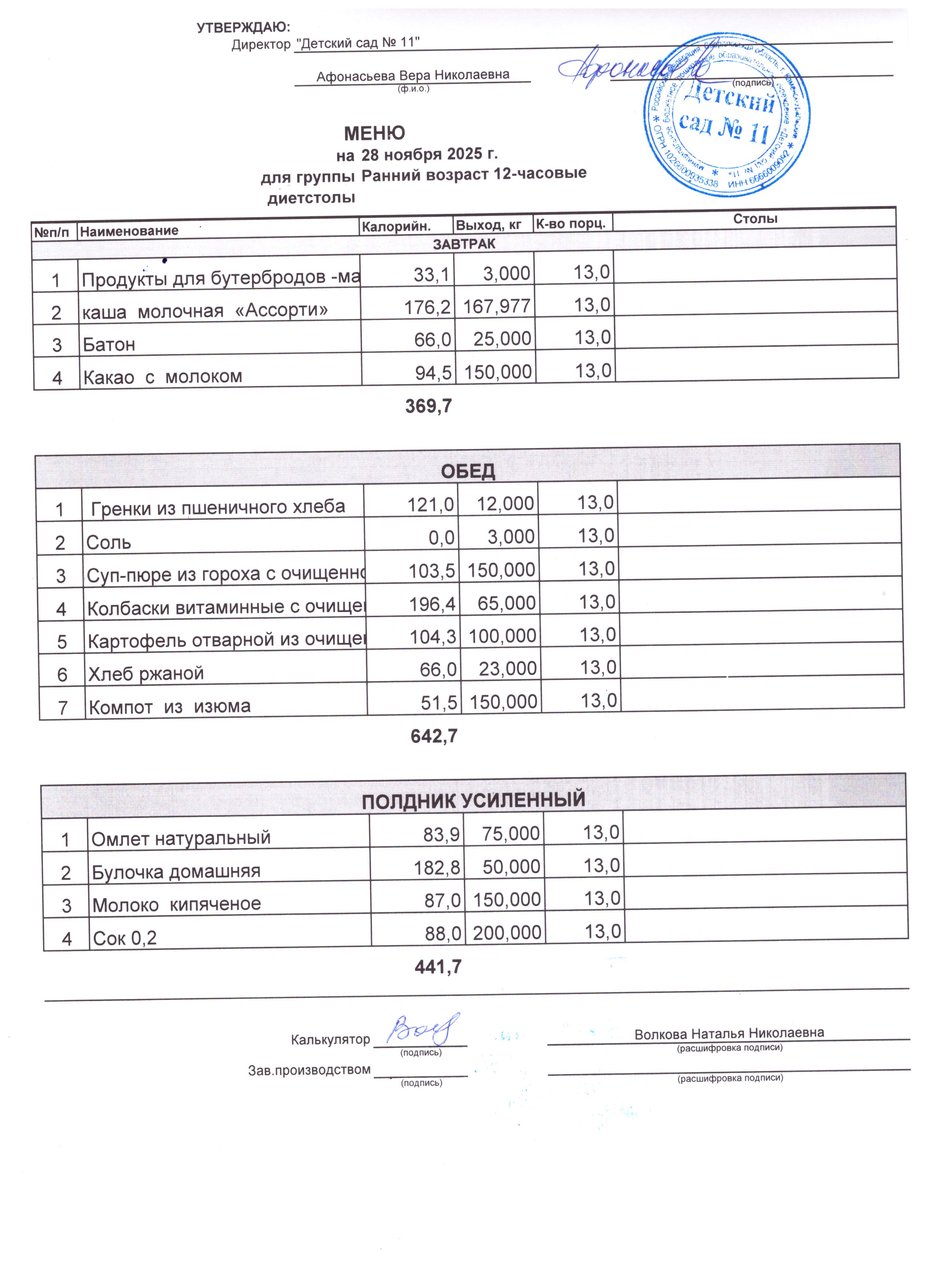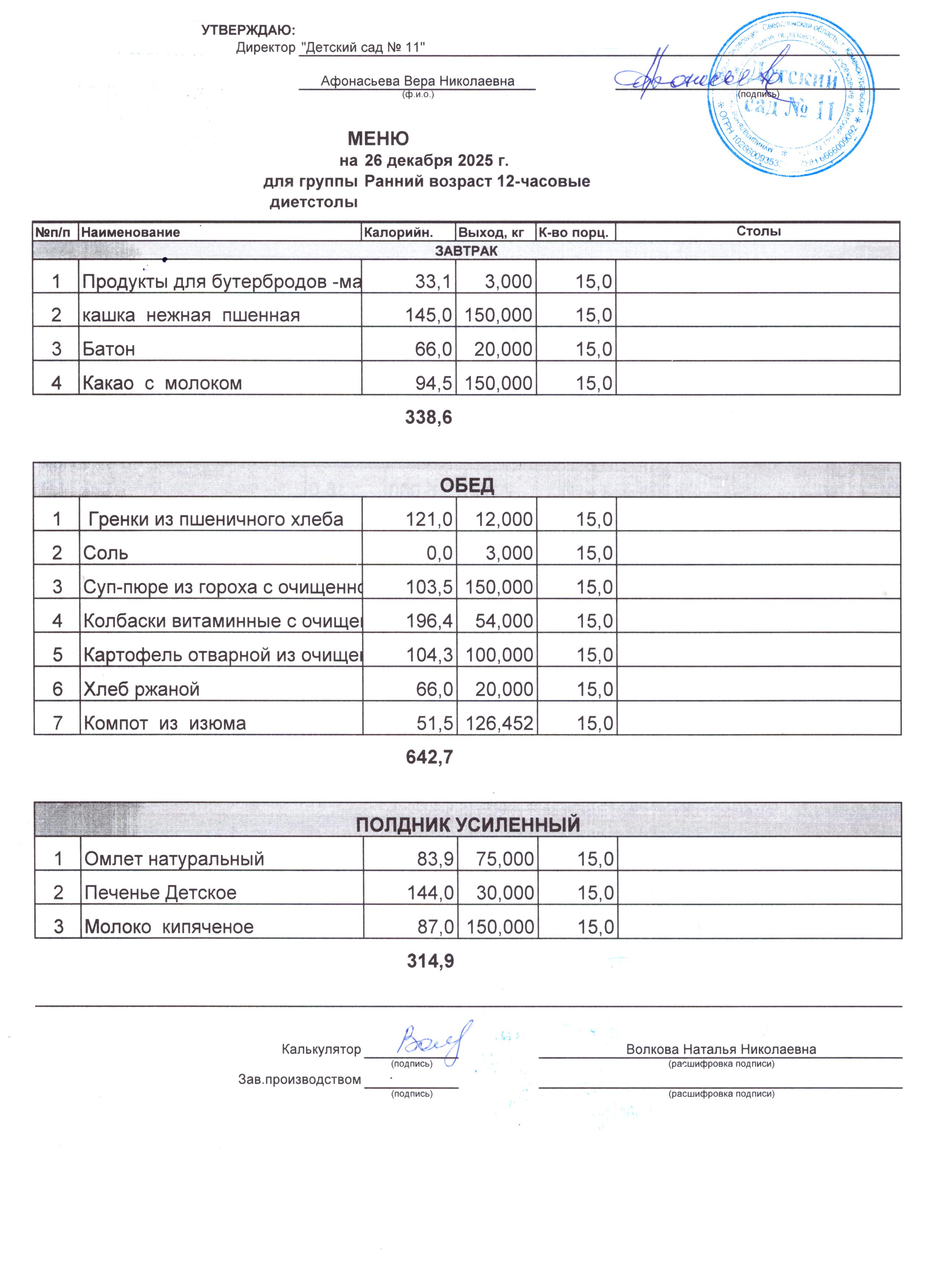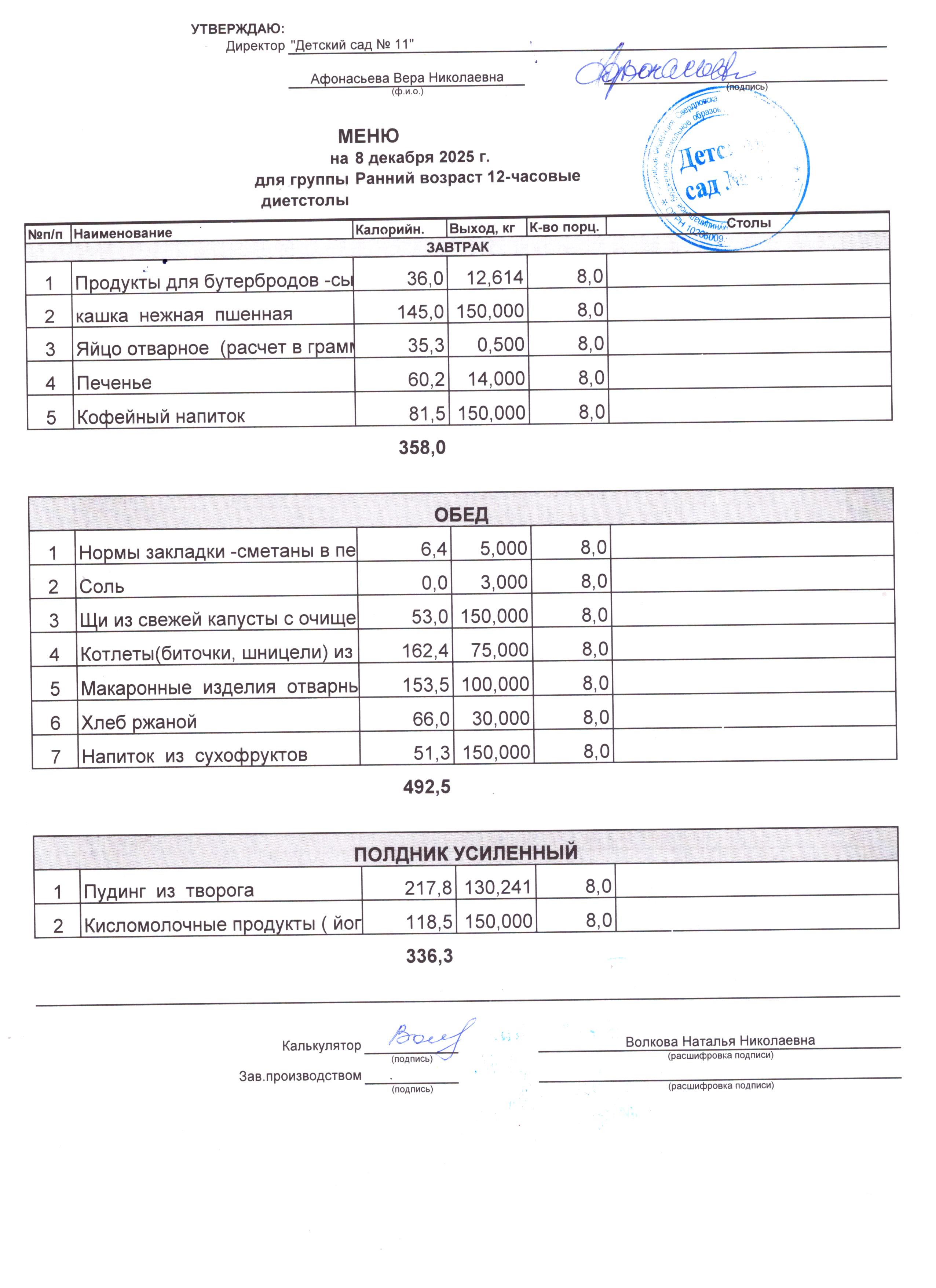 - Соки, фрукты, кисломолочные напитки включены в усиленный полдник.