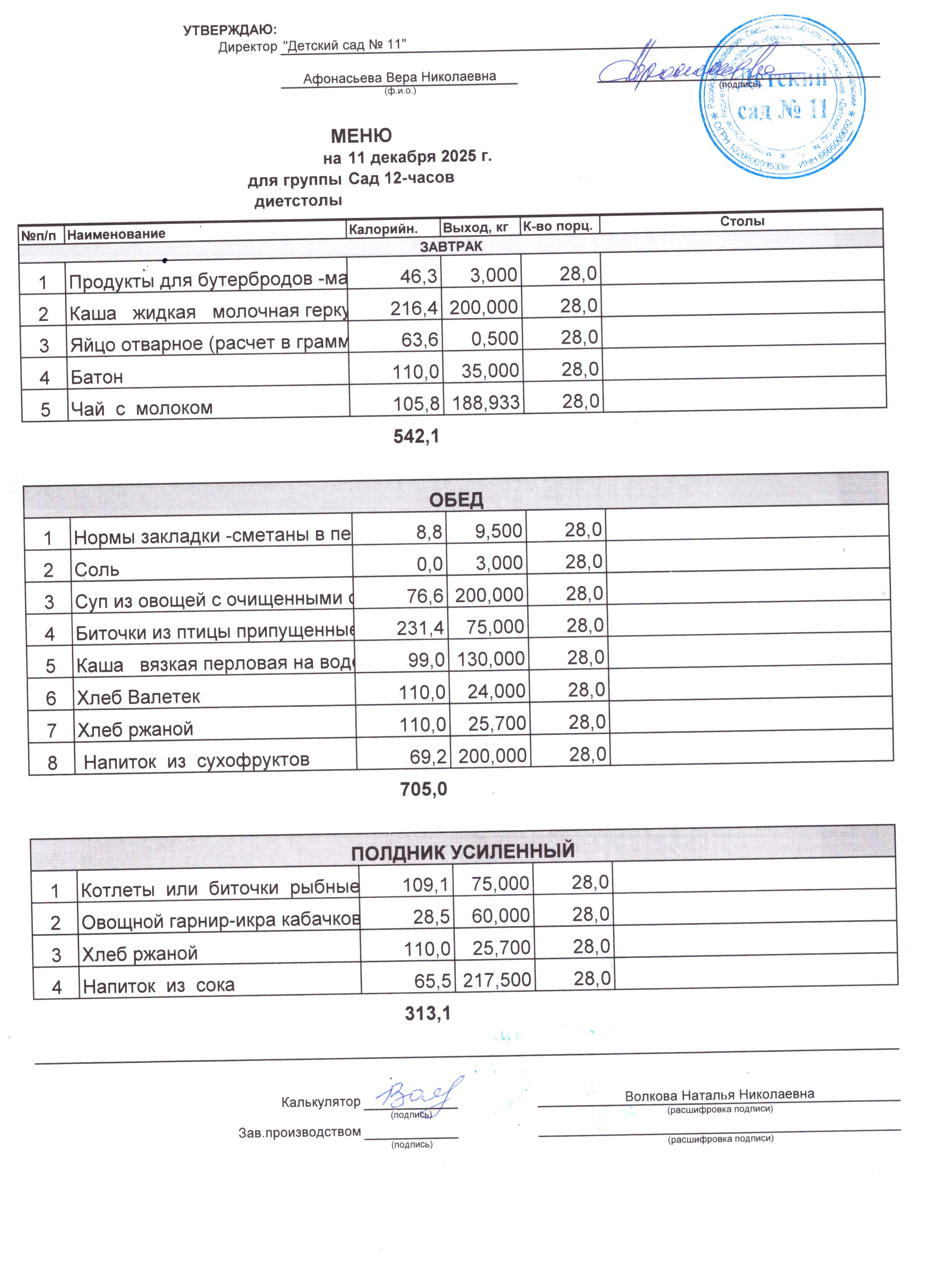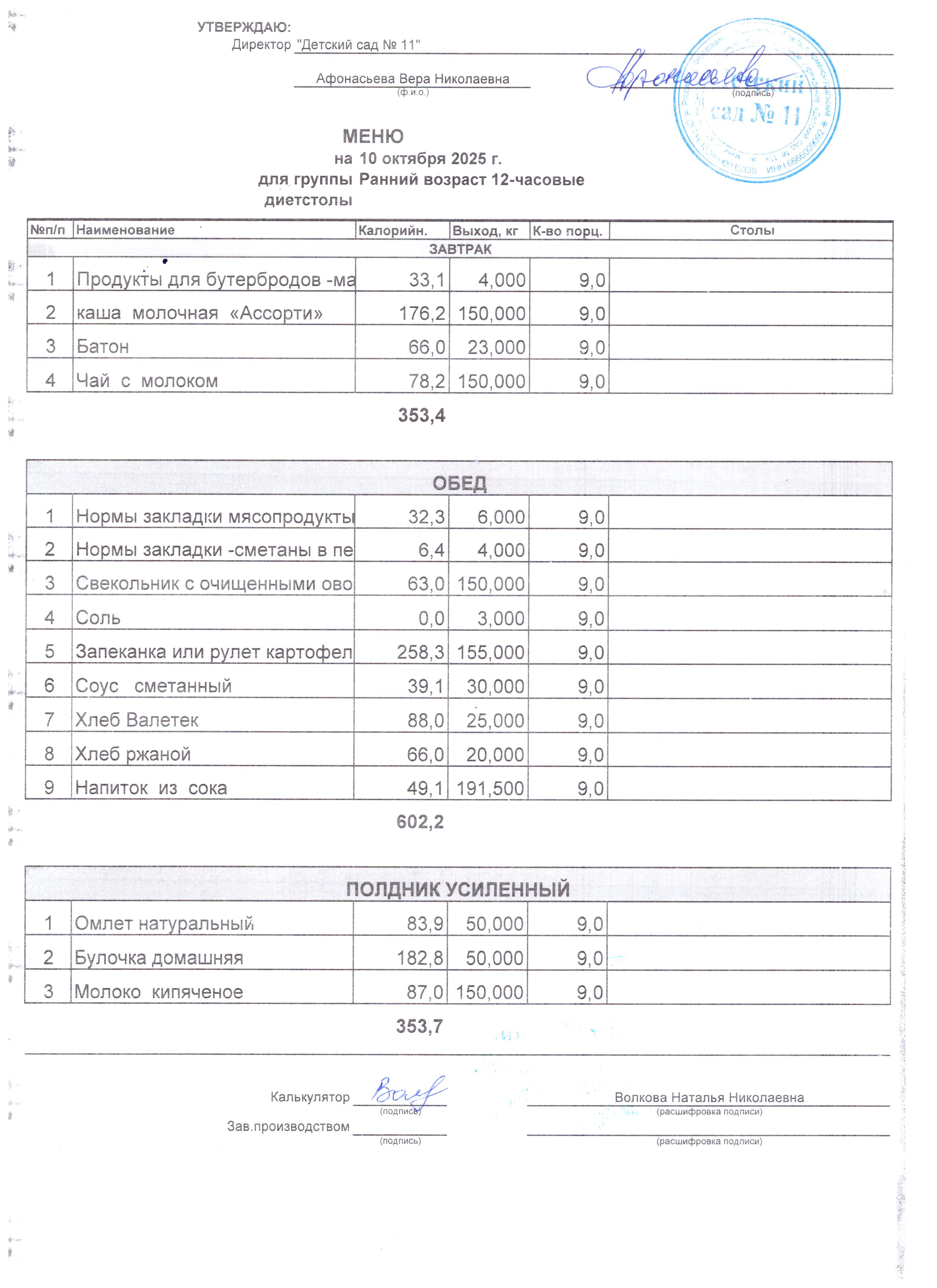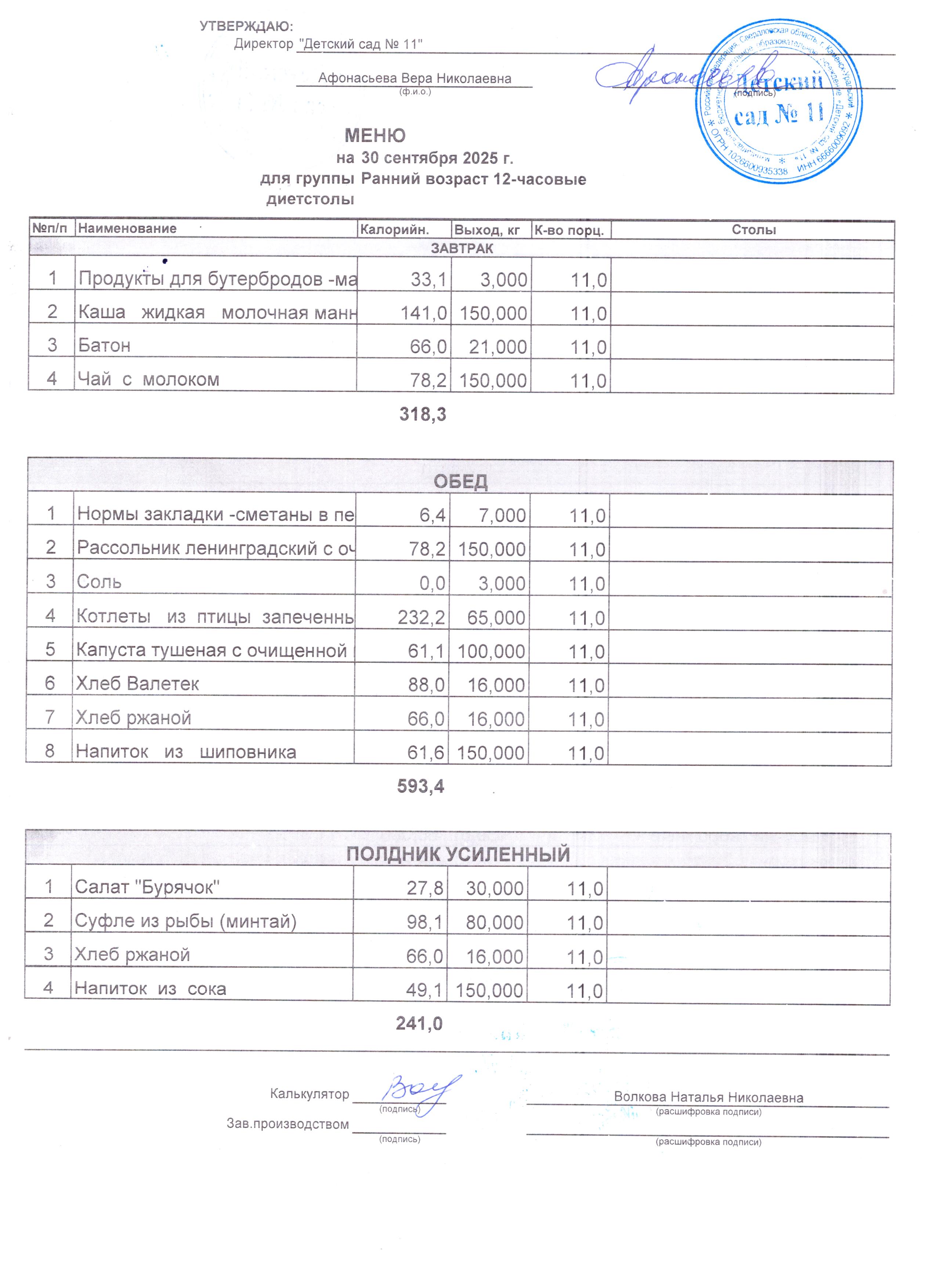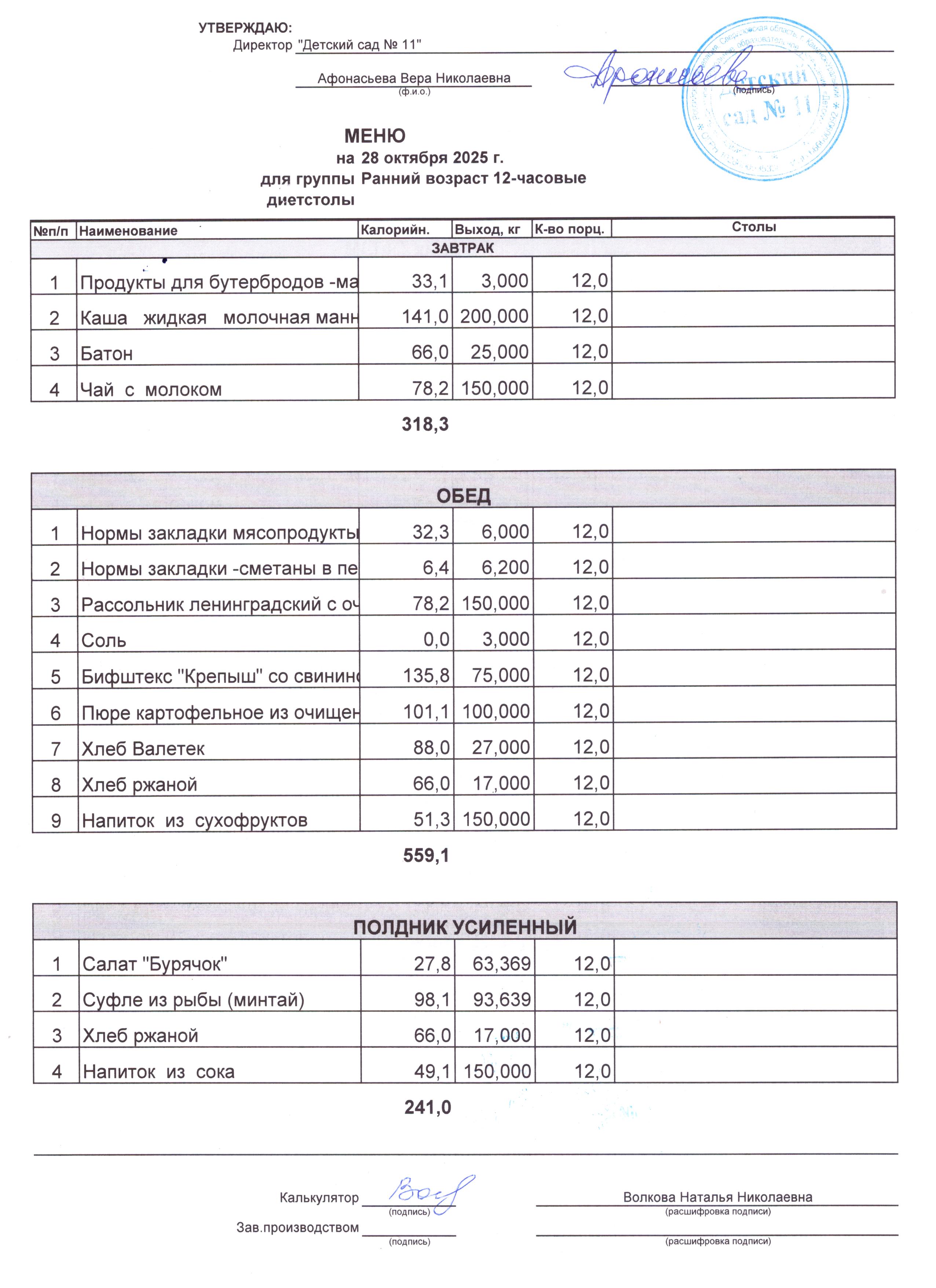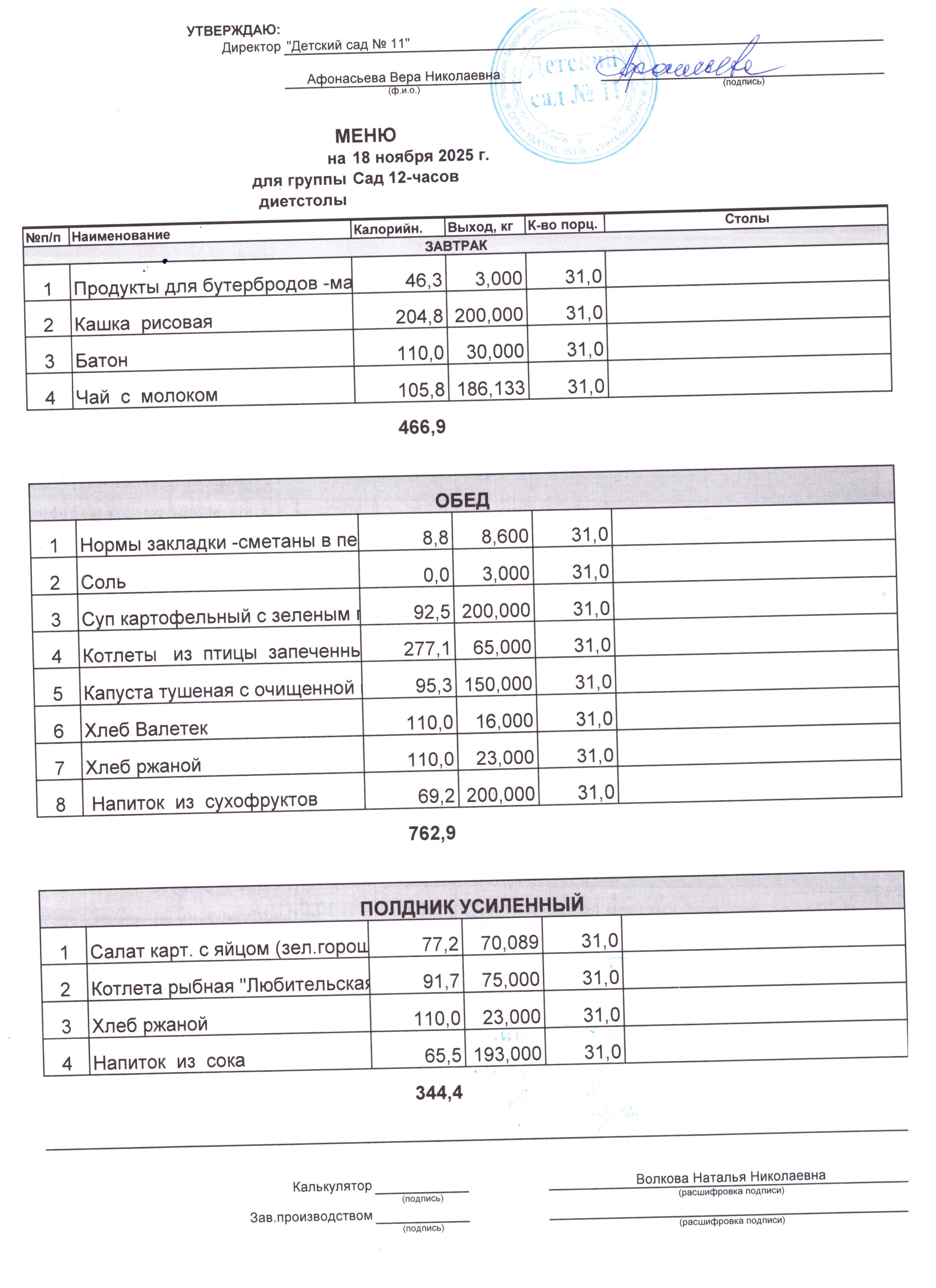 - Соки, фрукты, кисломолочные напитки включены в усиленный полдник.