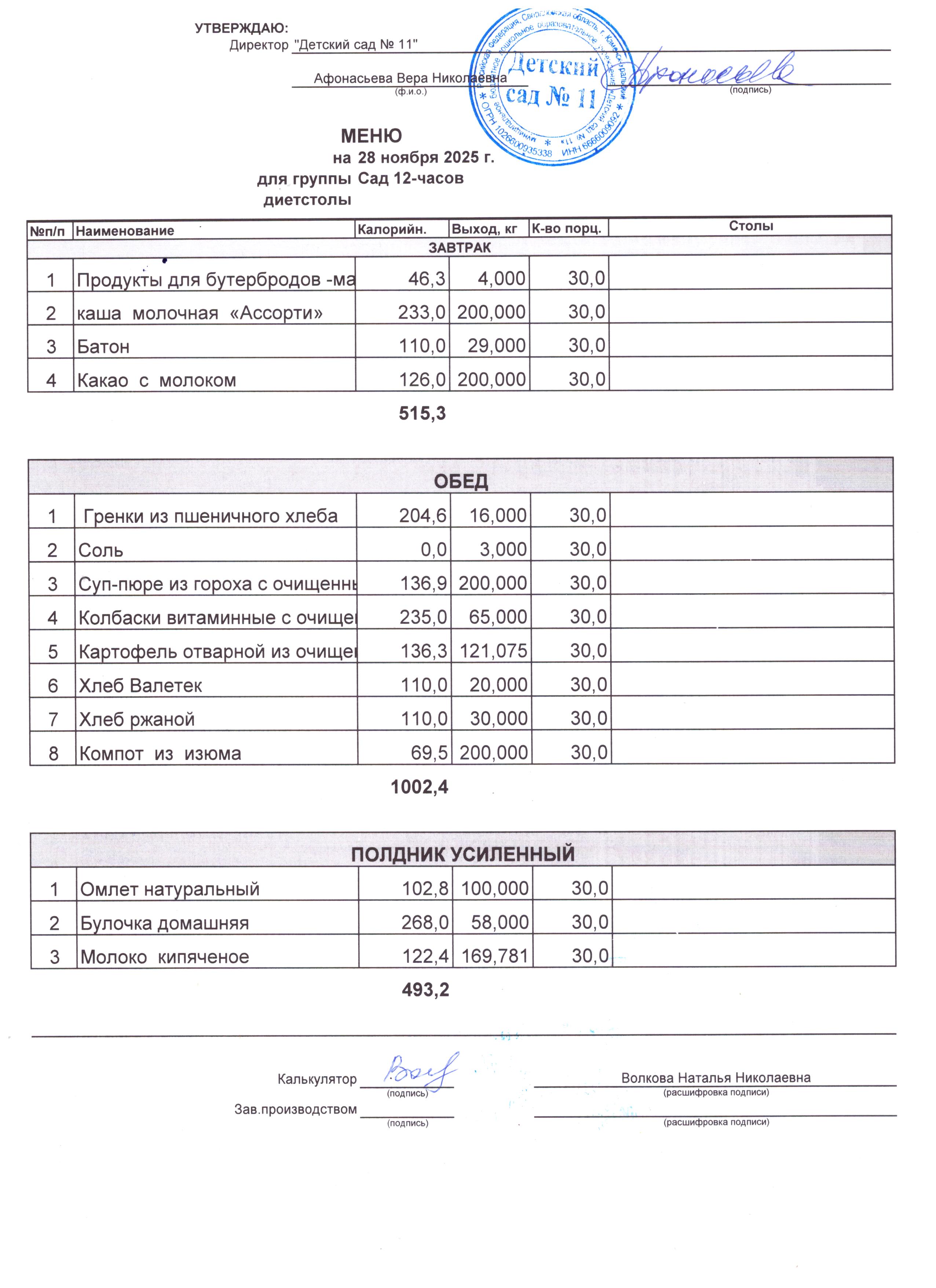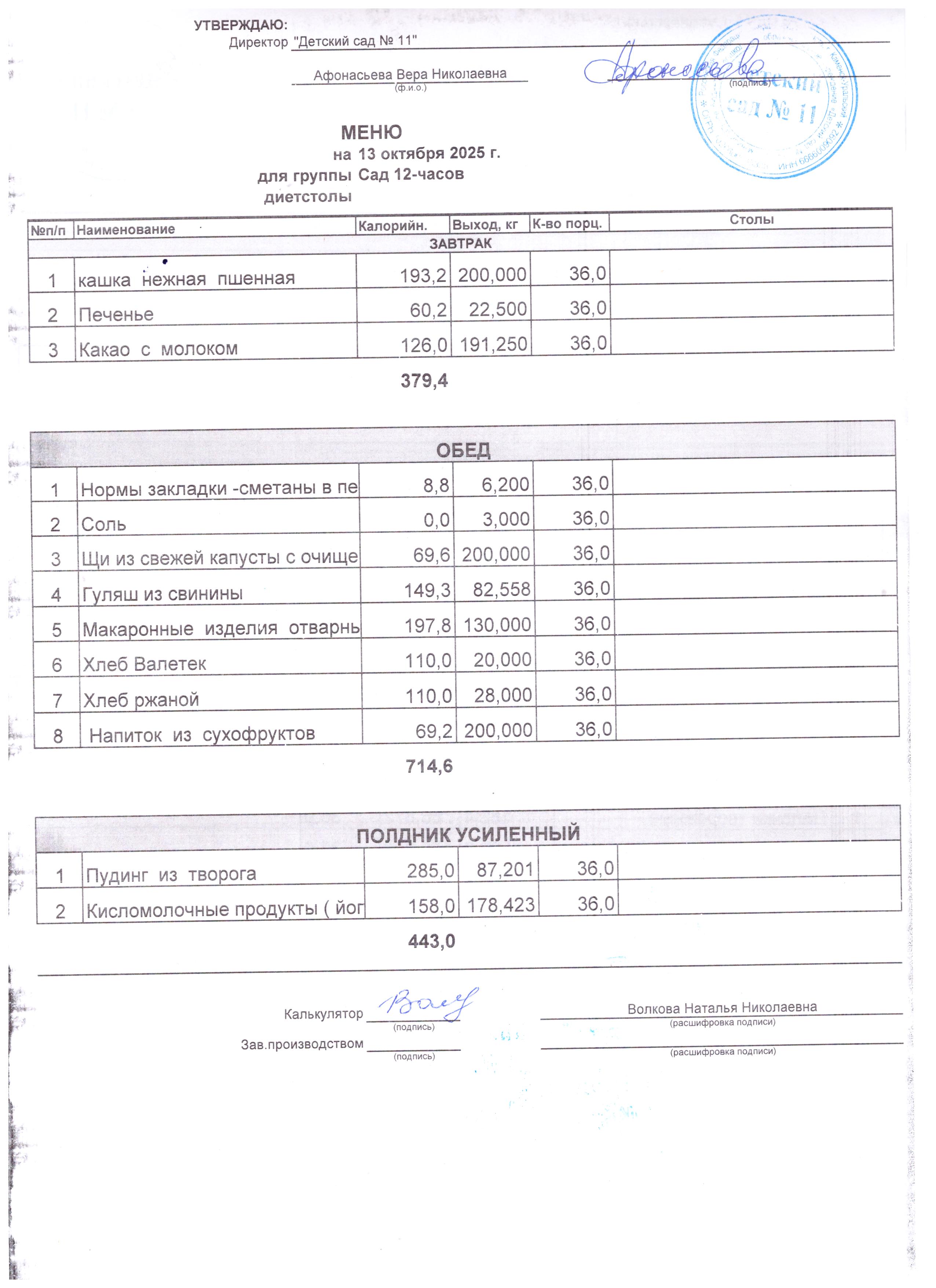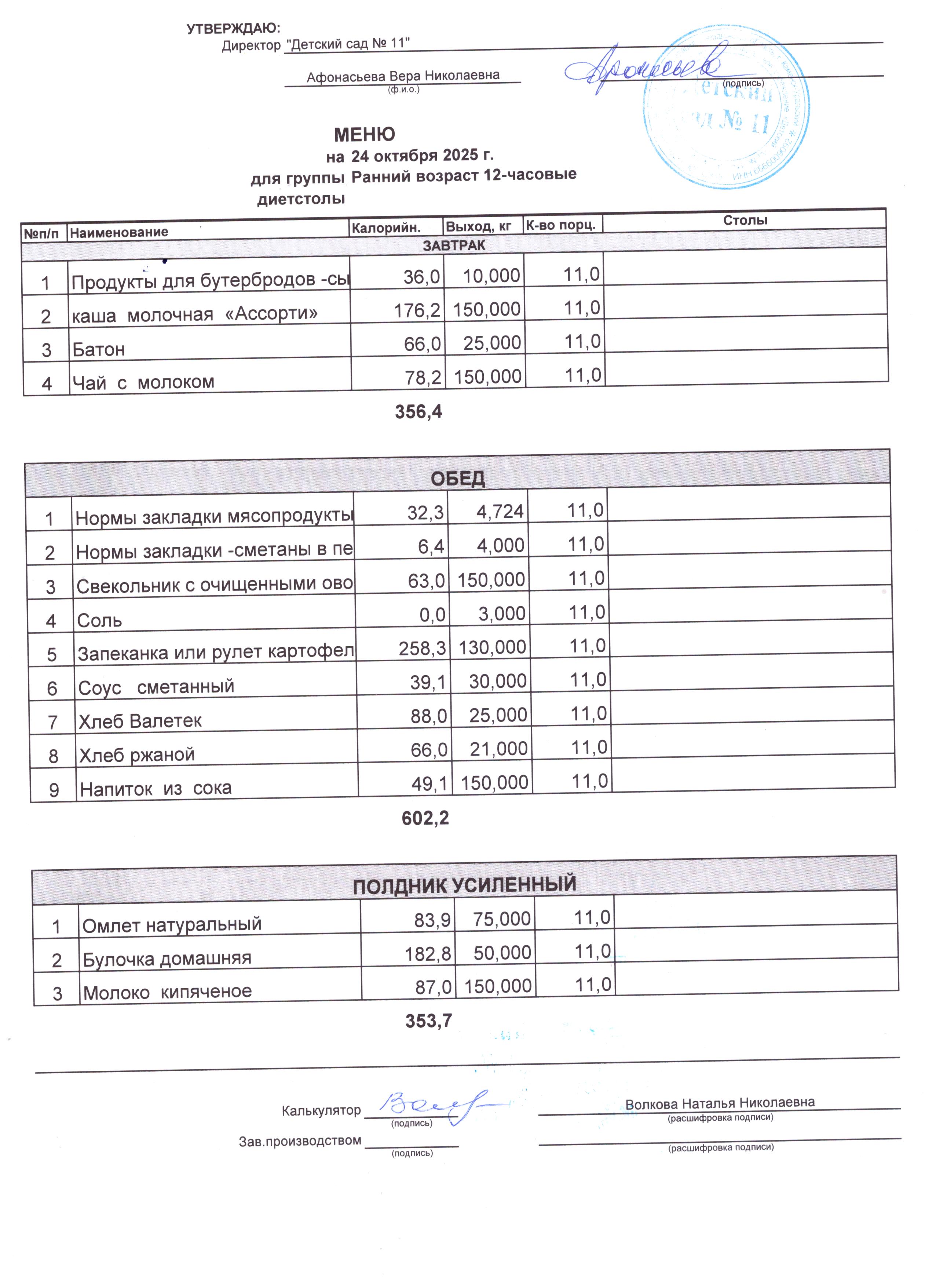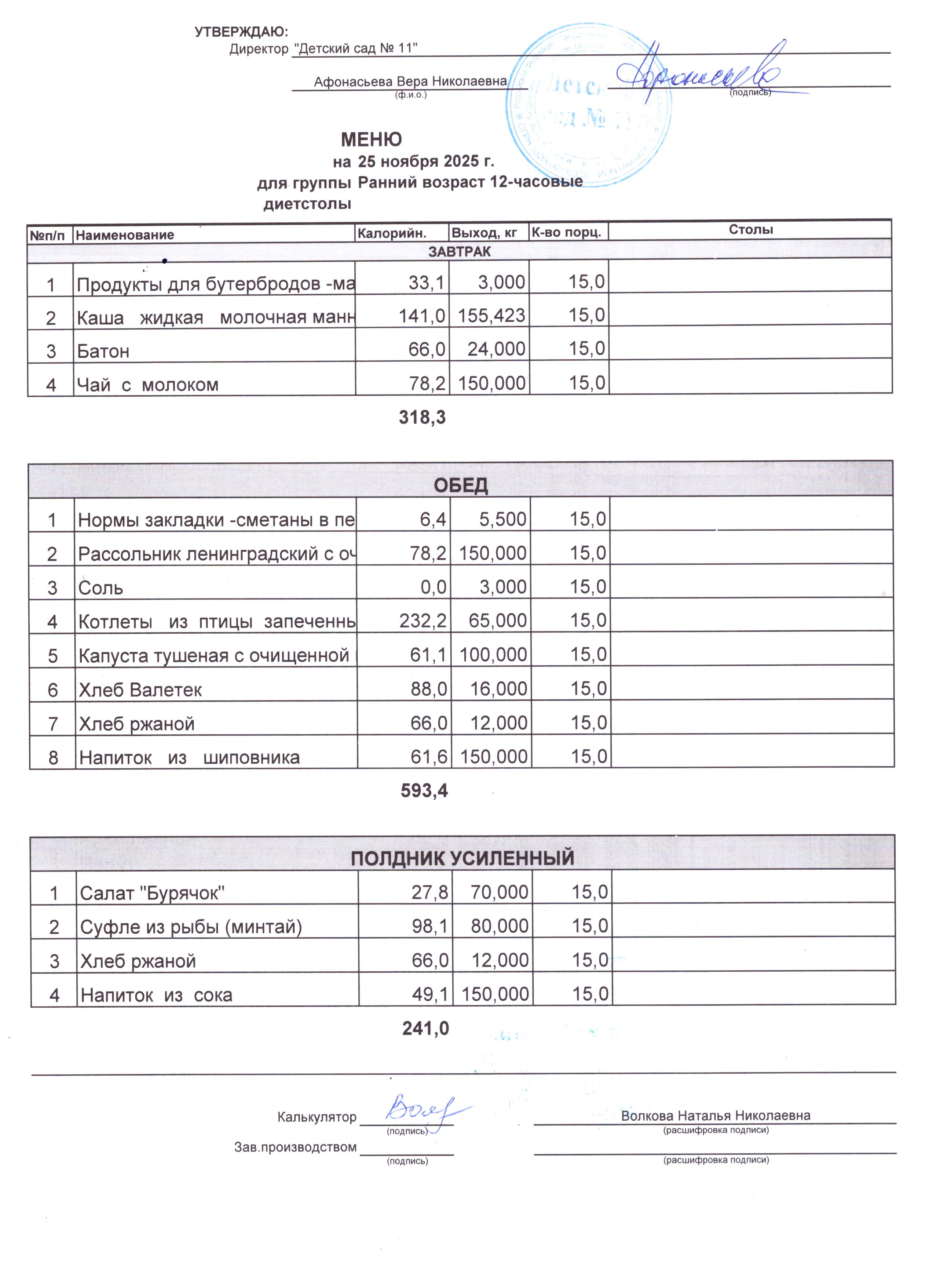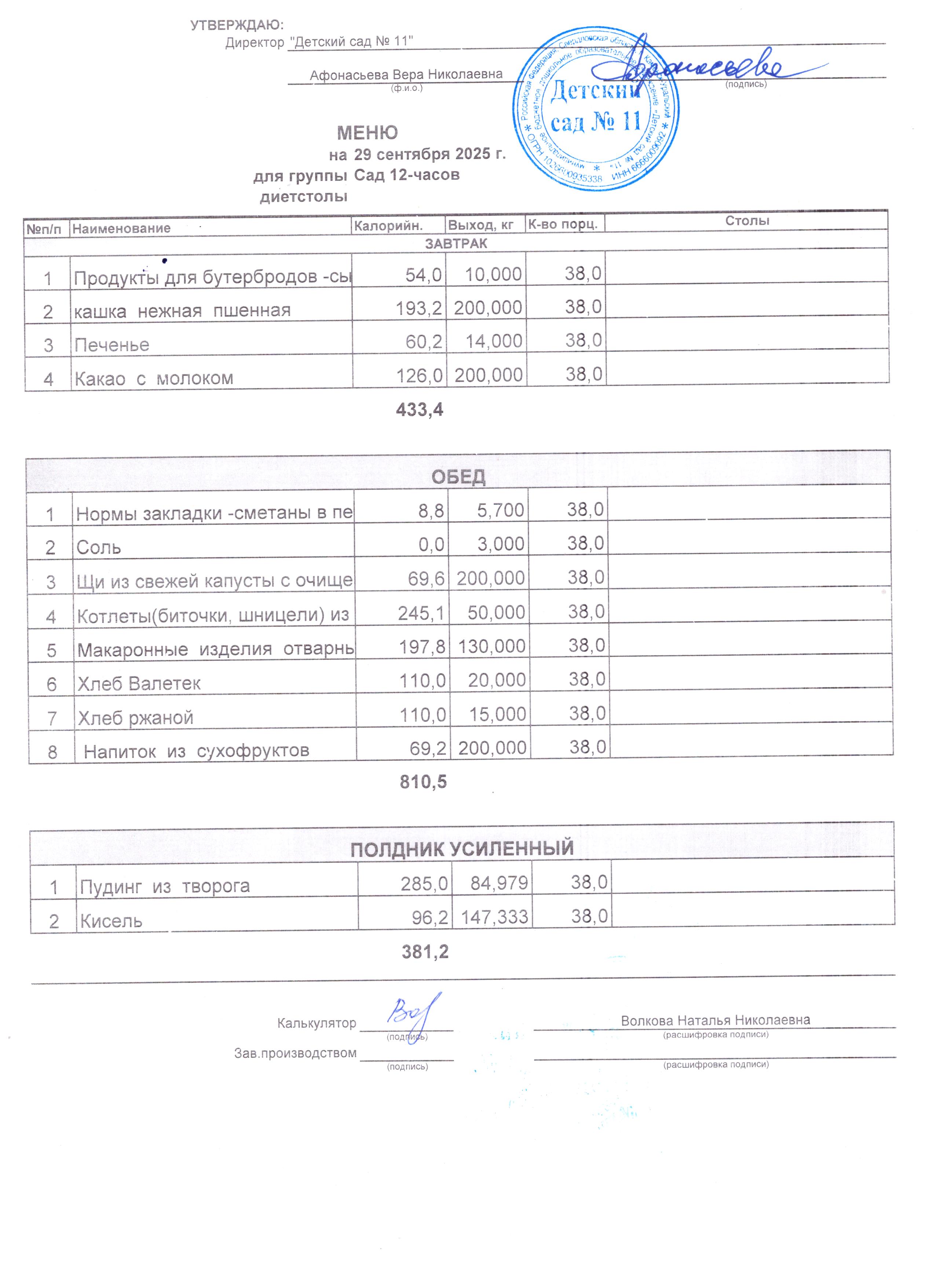 - Соки, фрукты, кисломолочные напитки включены в усиленный полдник.