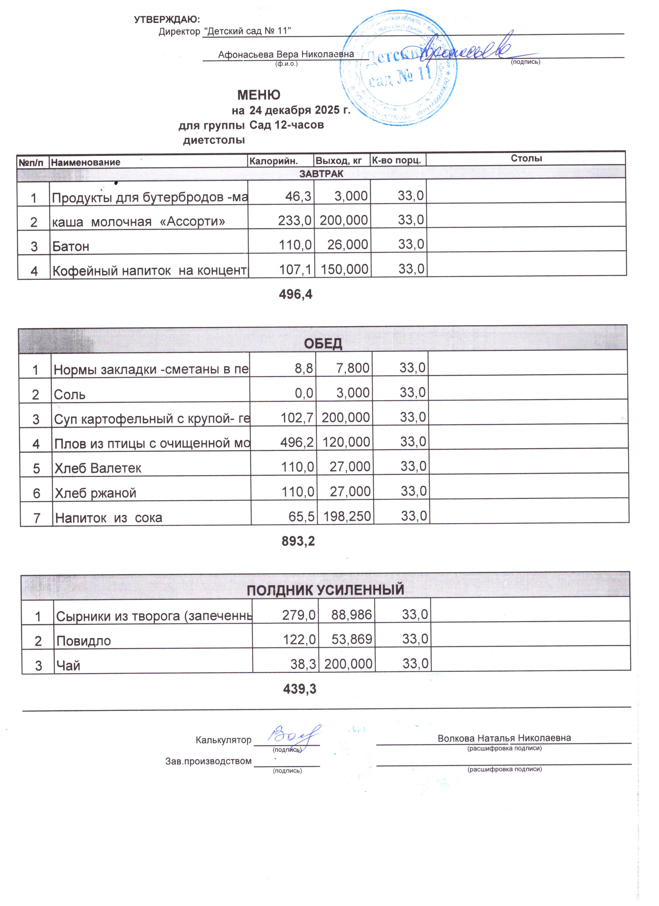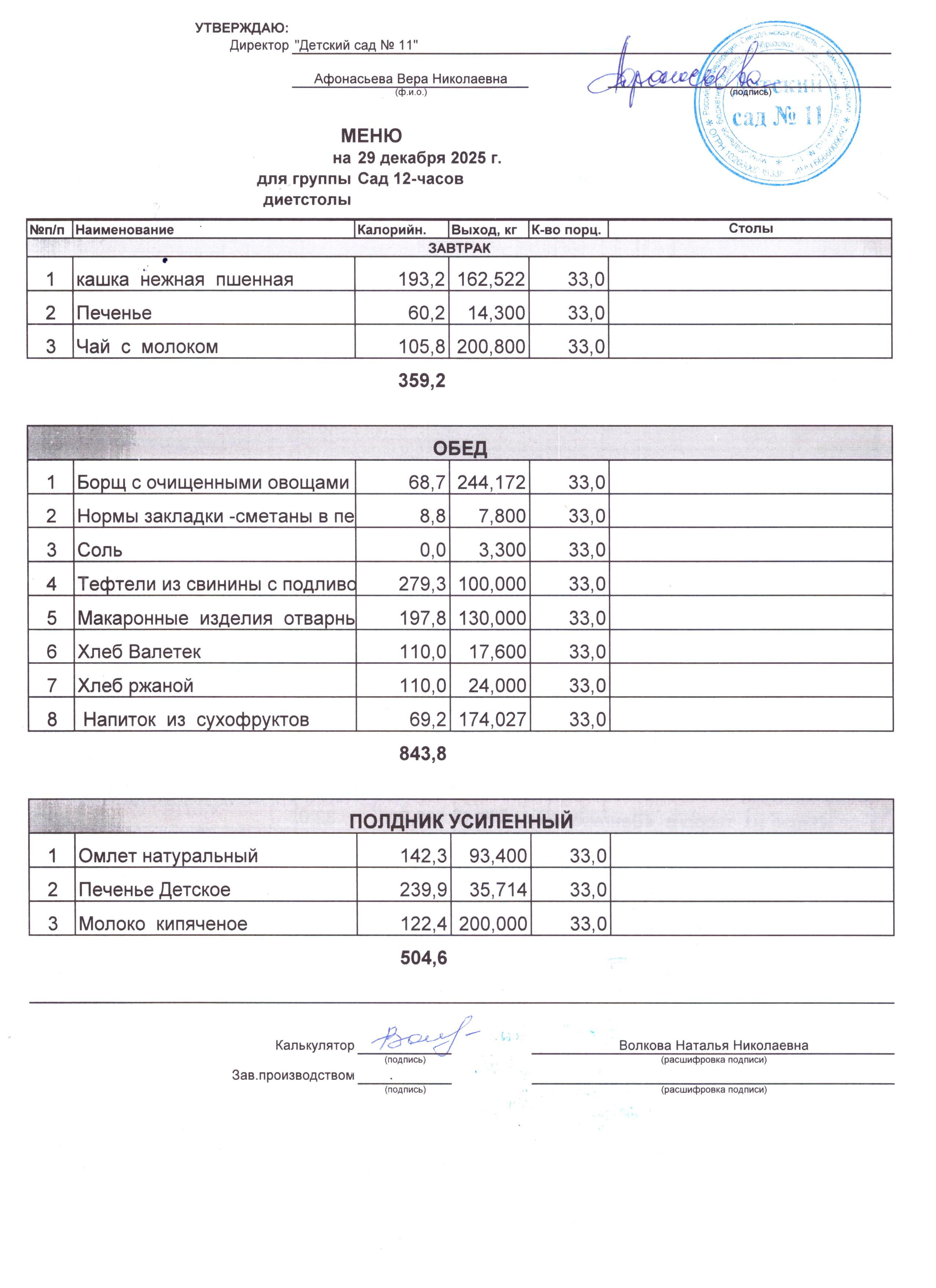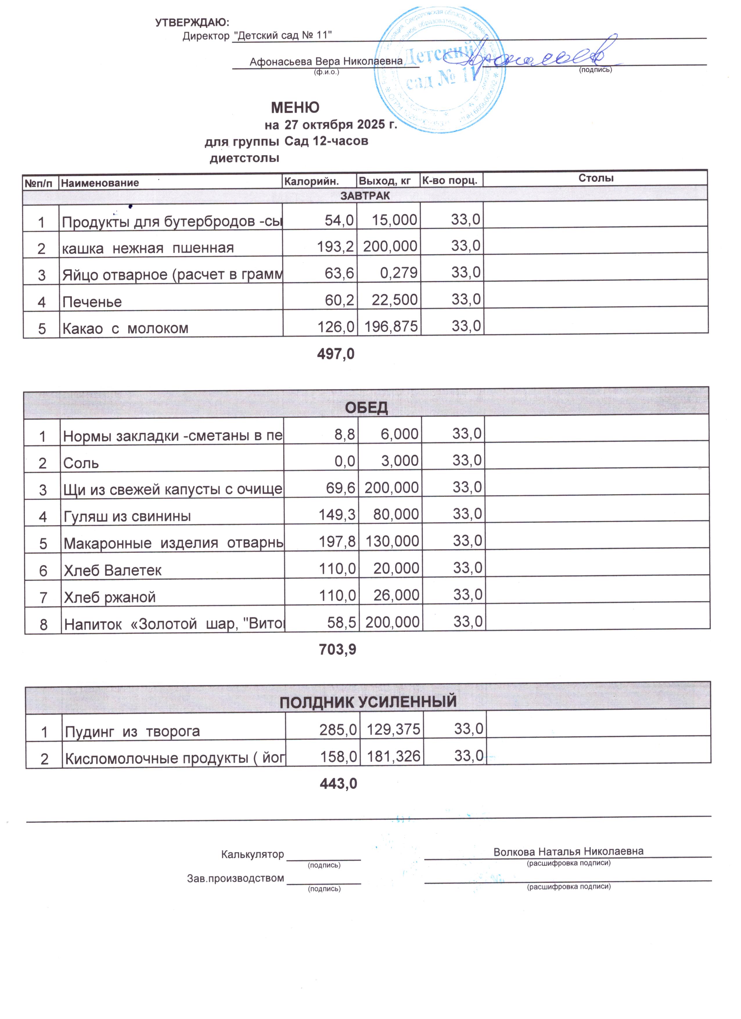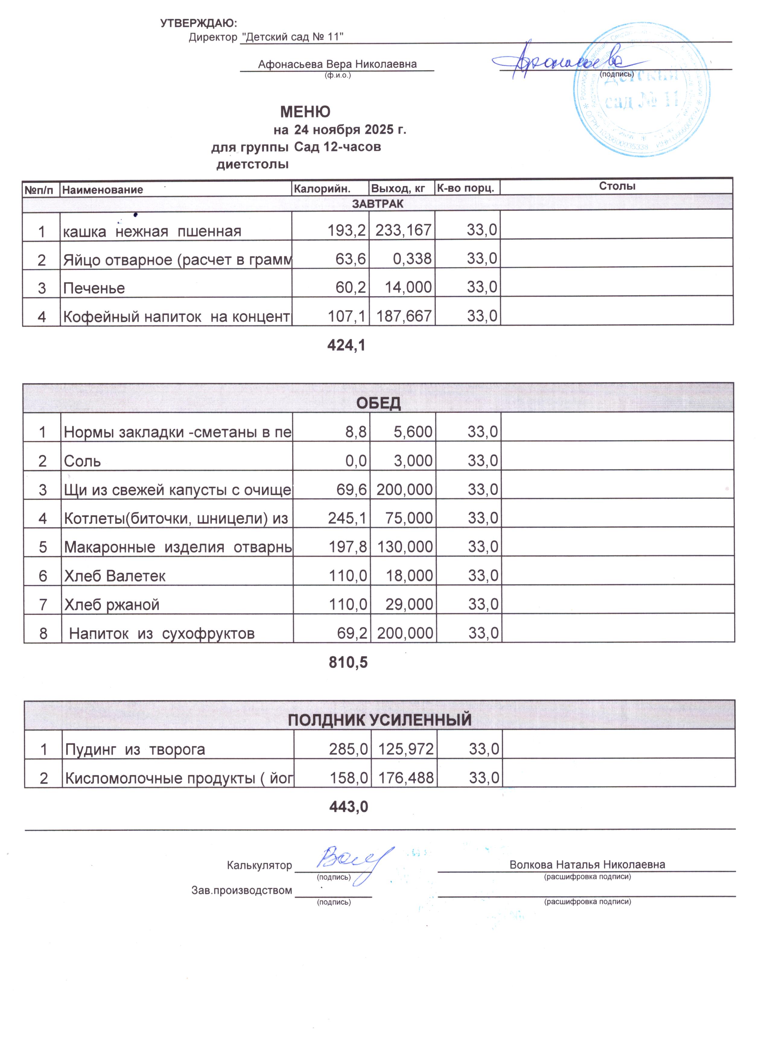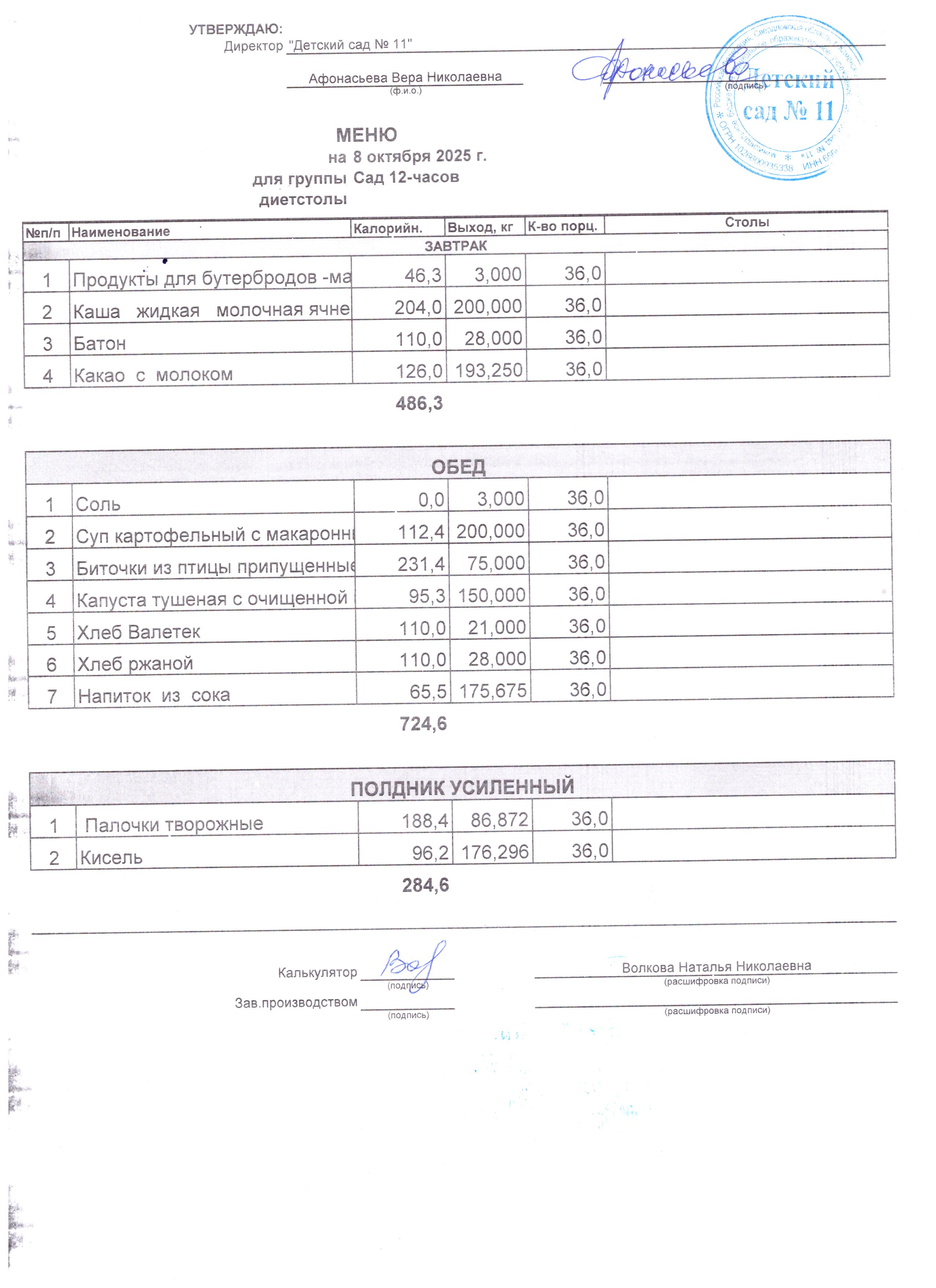- Соки, фрукты, кисломолочные напитки включены в усиленный полдник.