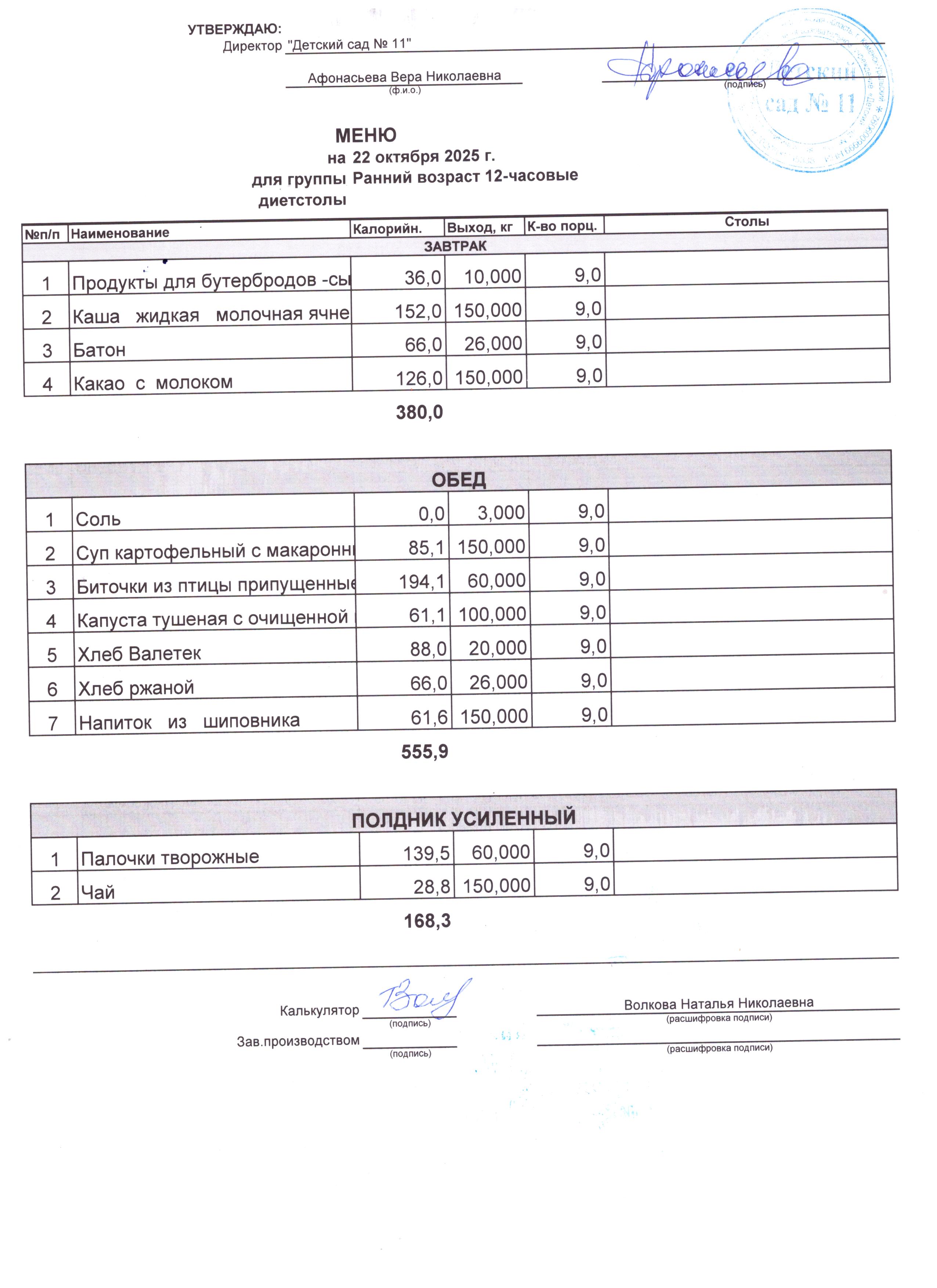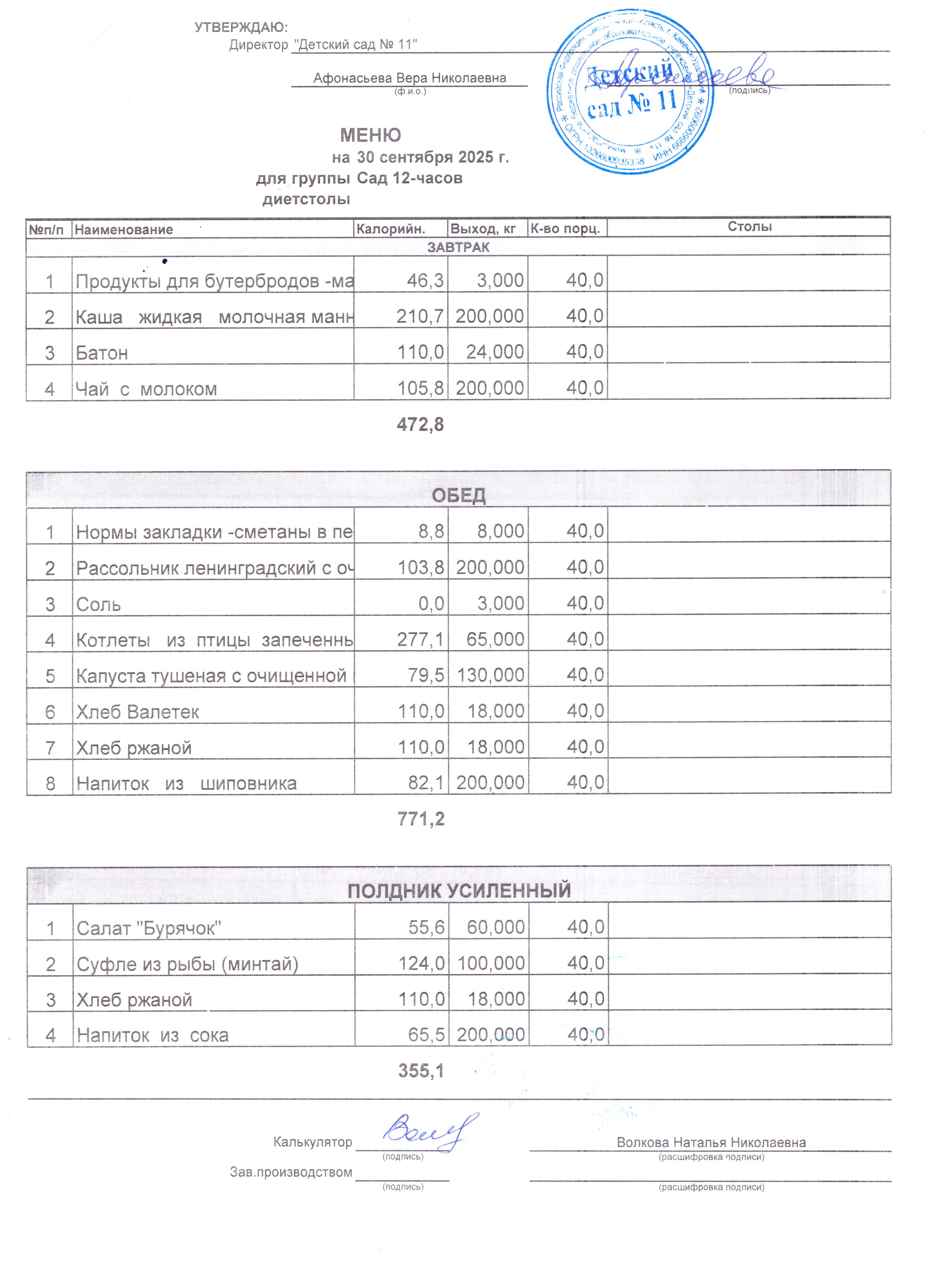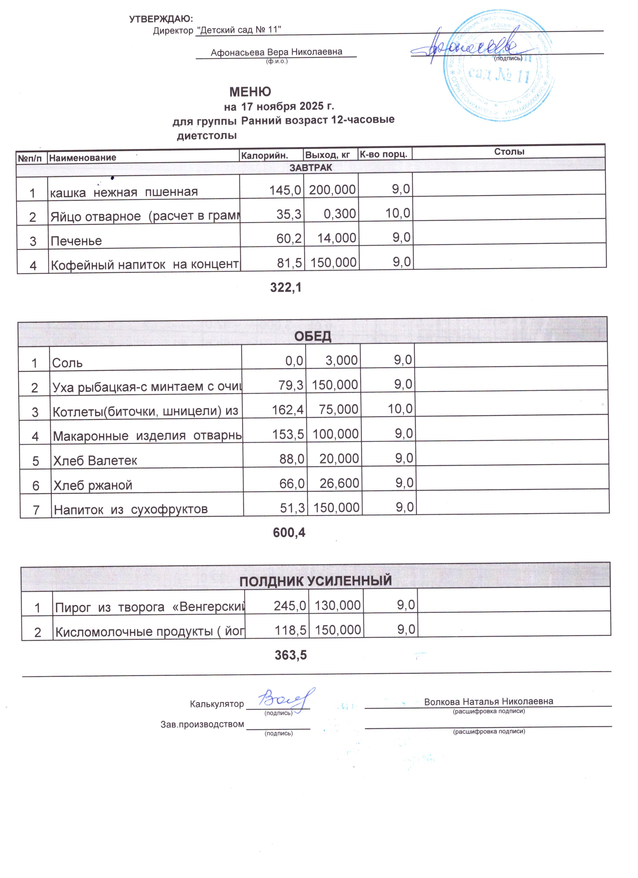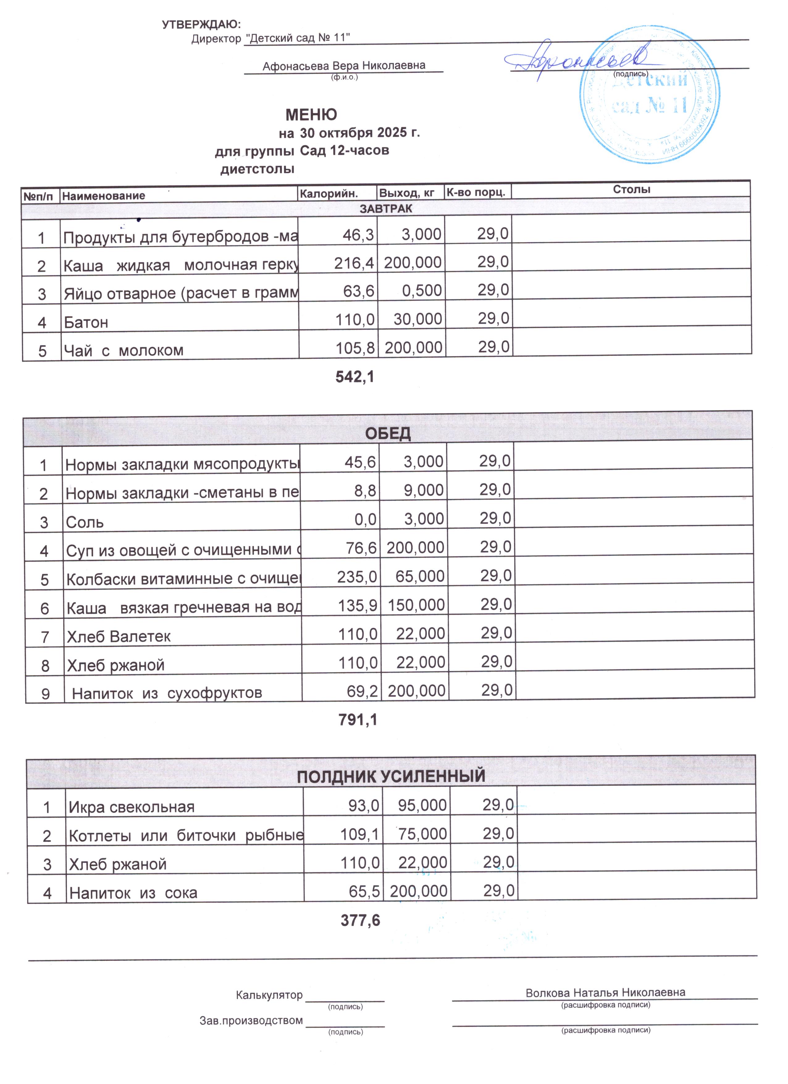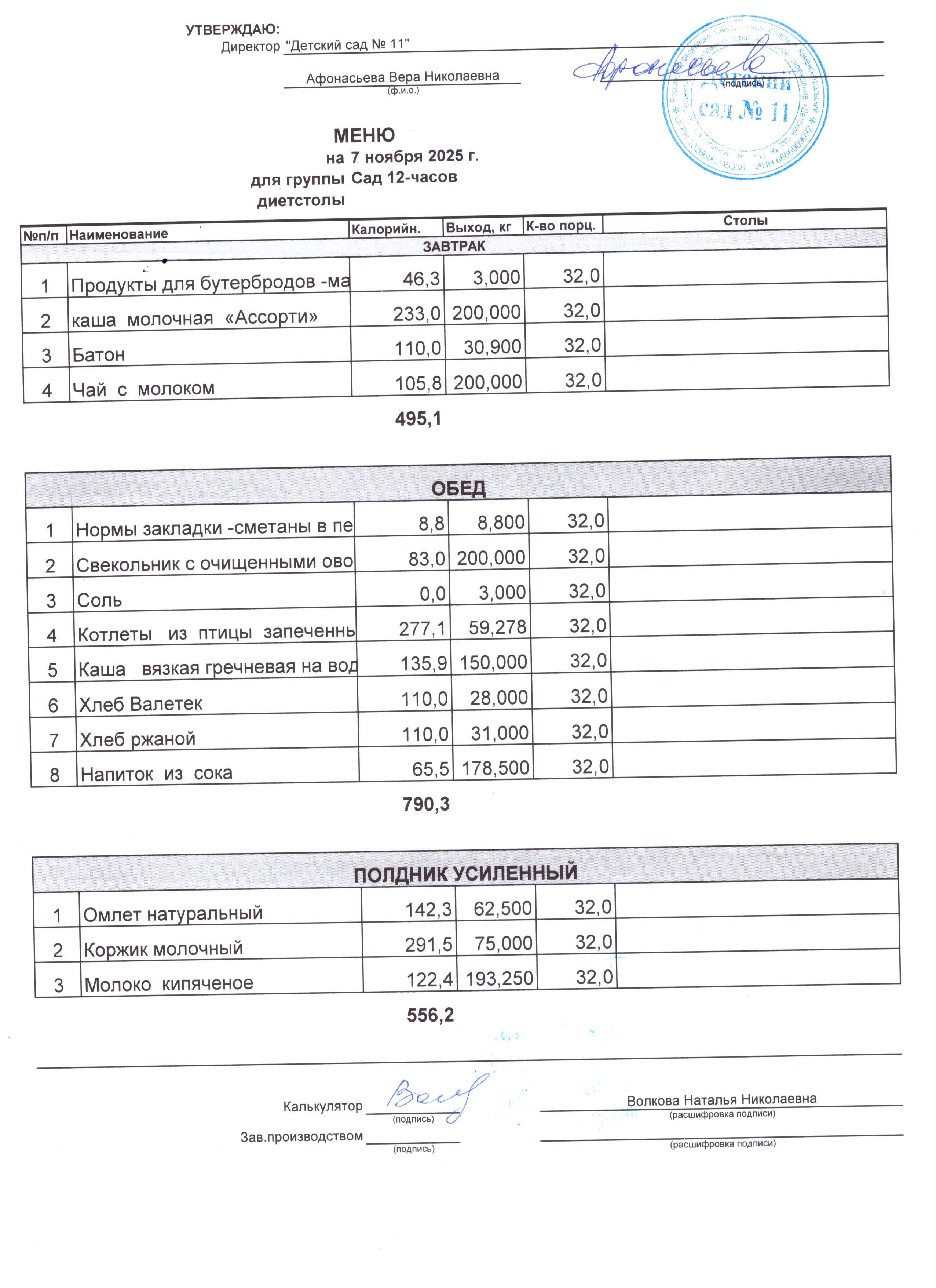 - Соки, фрукты, кисломолочные напитки включены в усиленный полдник.
