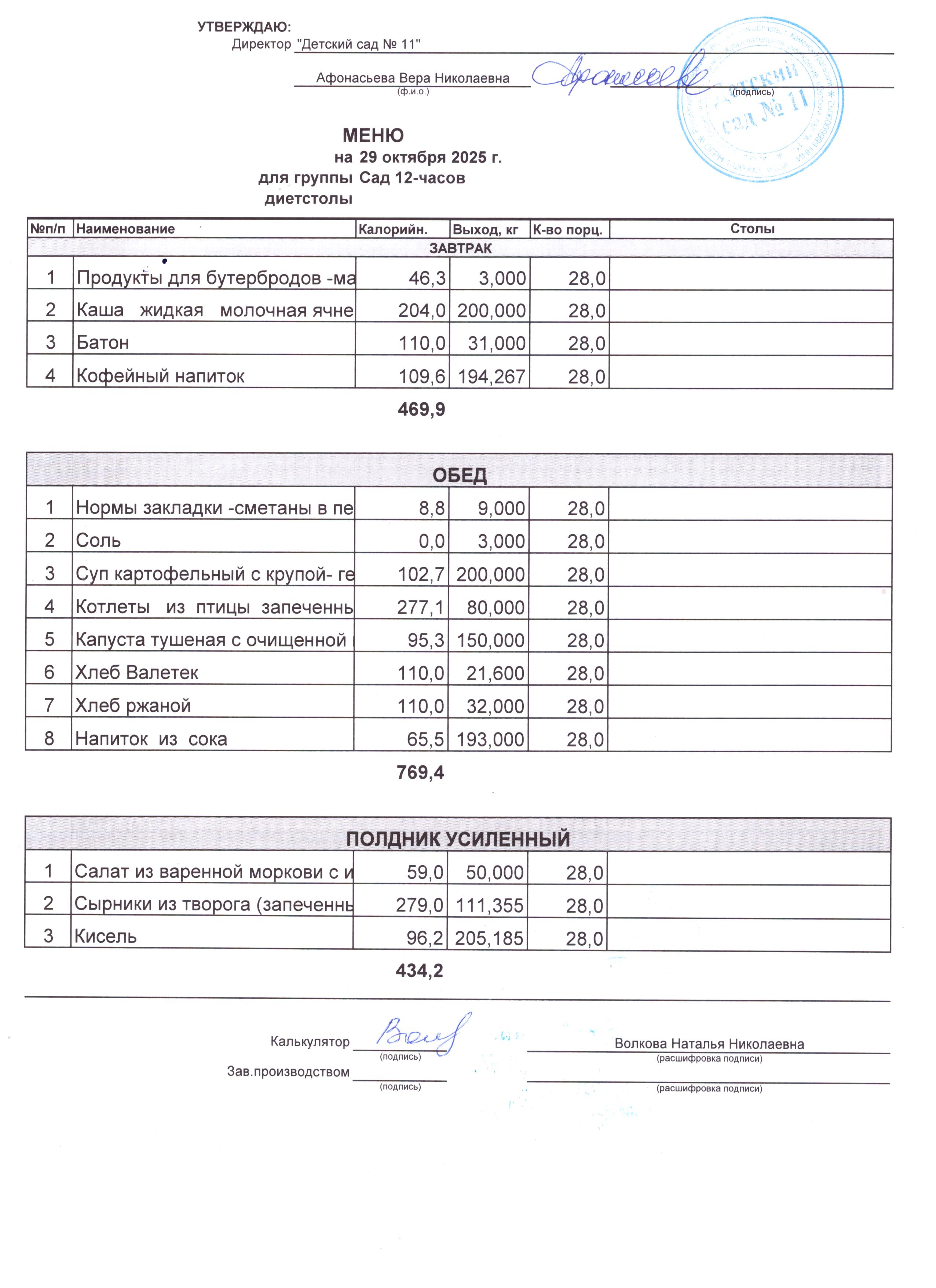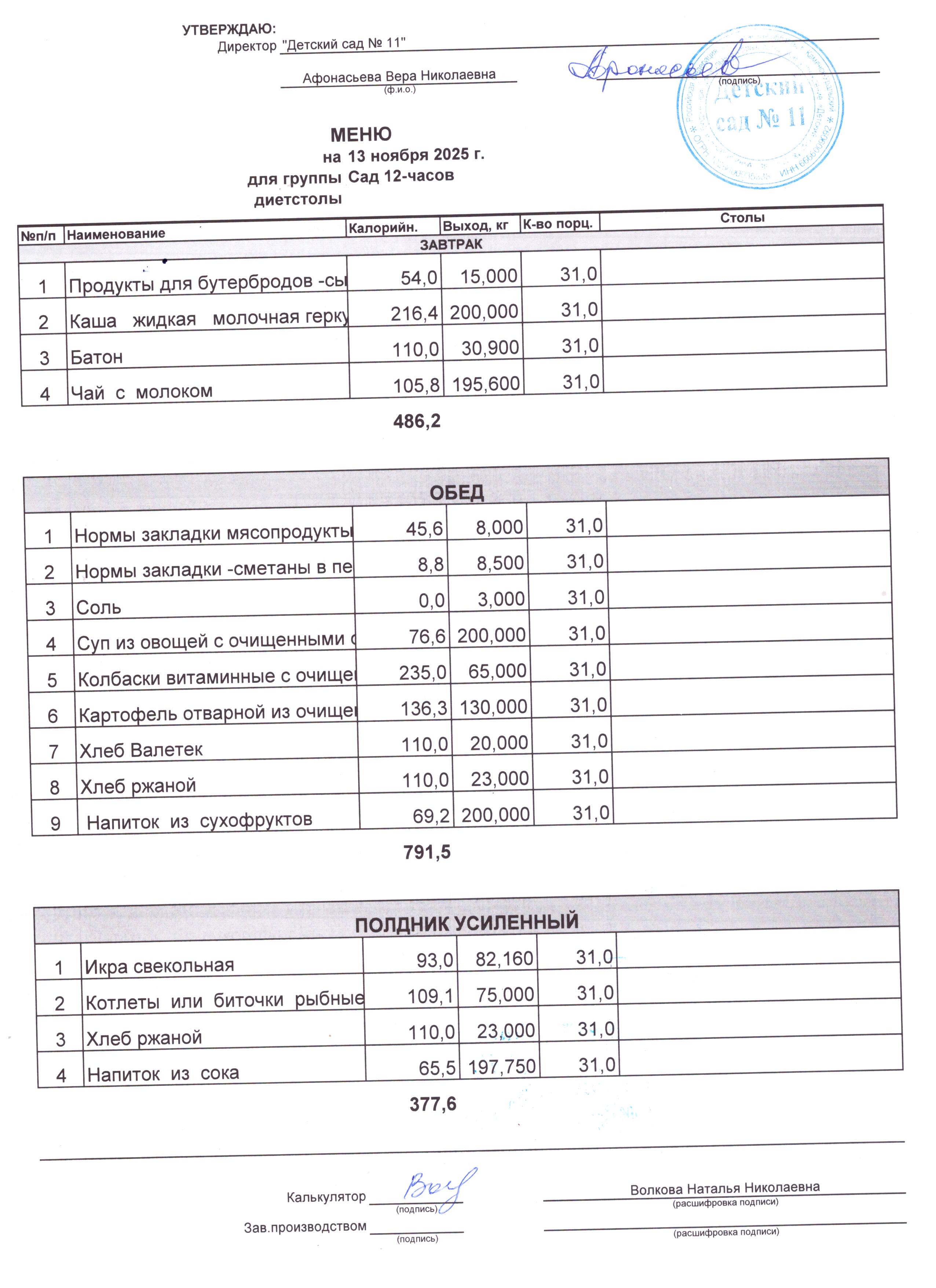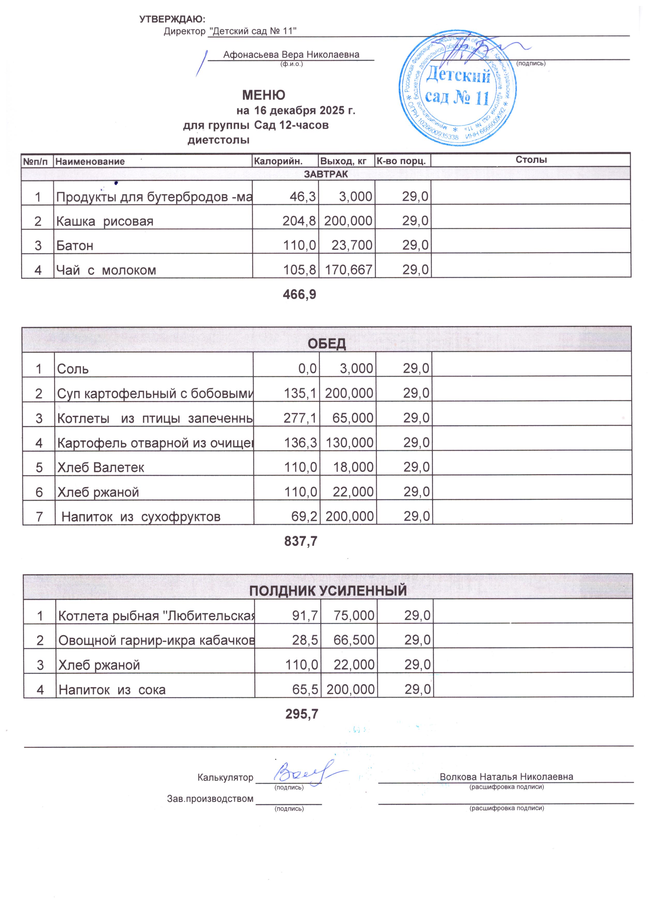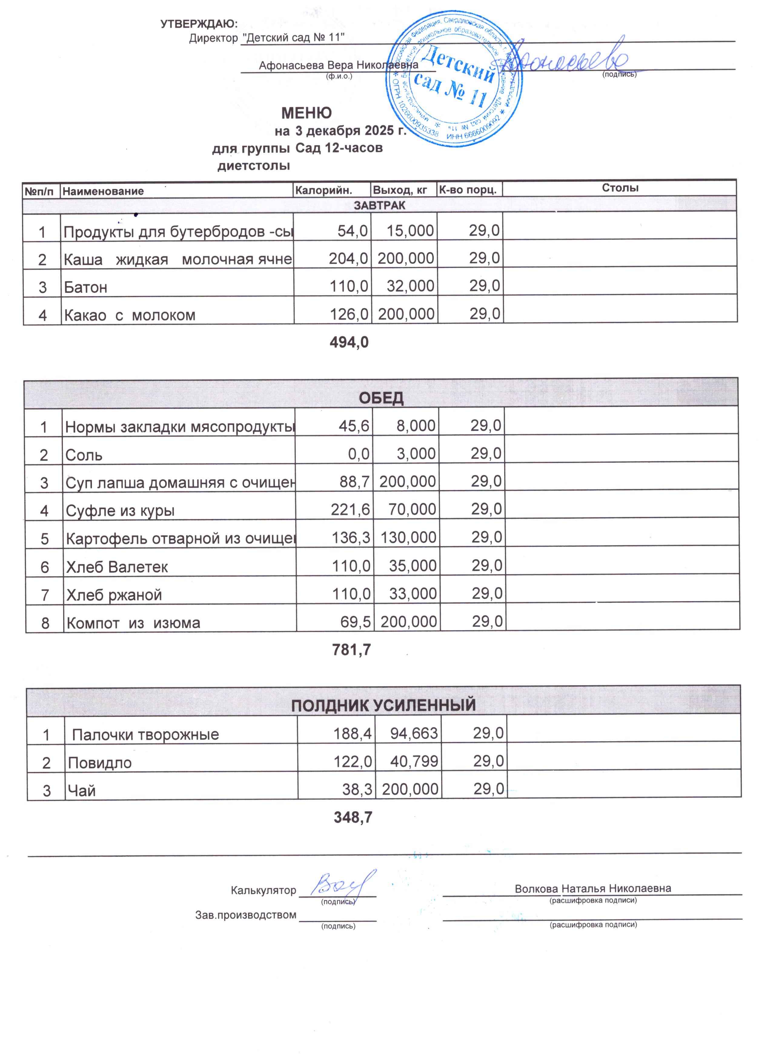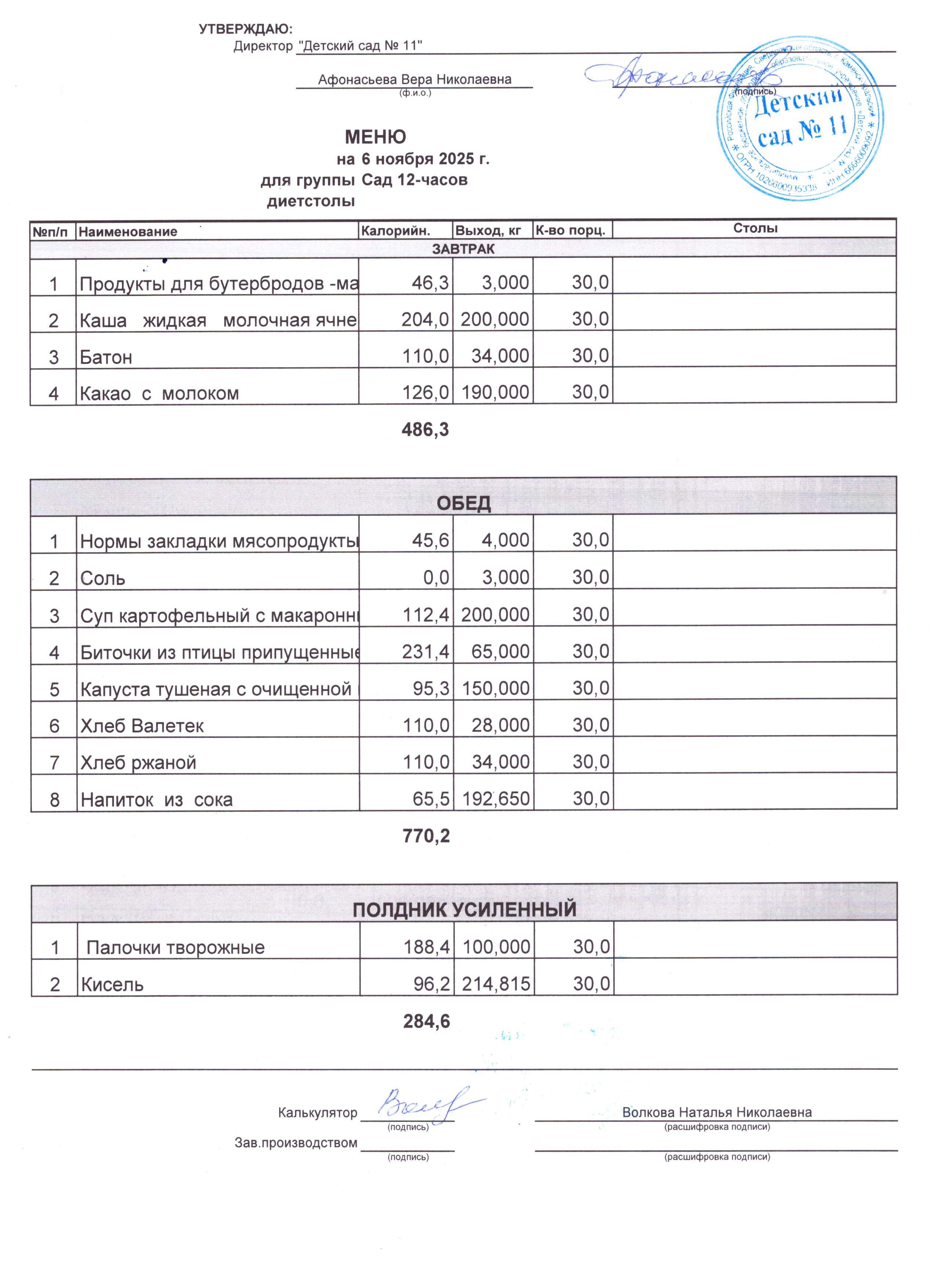 - Соки, фрукты, кисломолочные напитки включены в усиленный полдник.