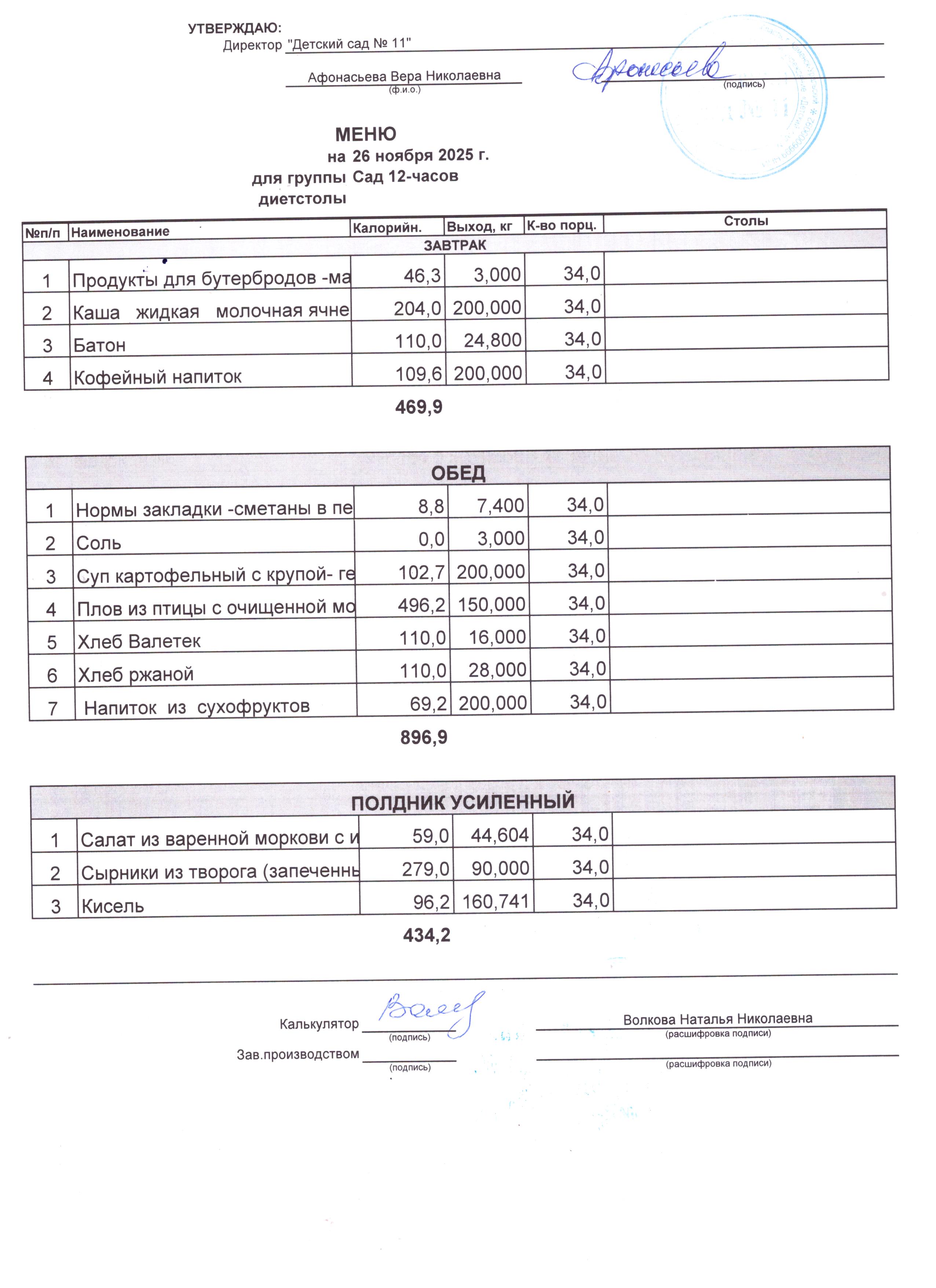 Прмерное двухнедельное меню, утвержденное руководителем ОУ.